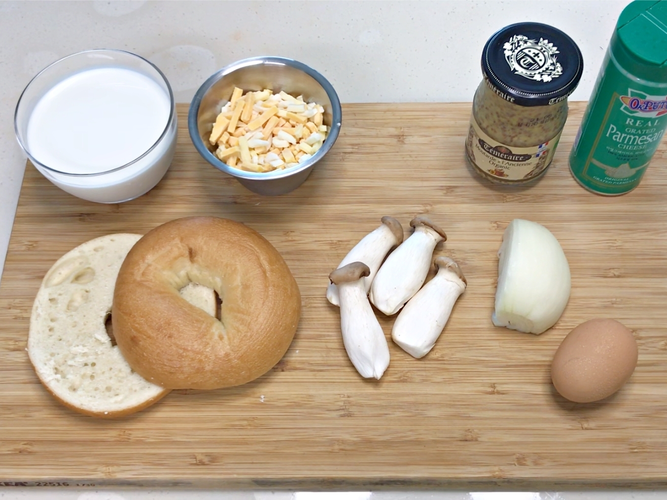 재료는 베이글, 버섯, 양파, 달걀, 모짜렐라치즈,