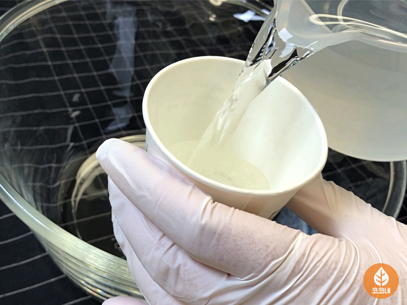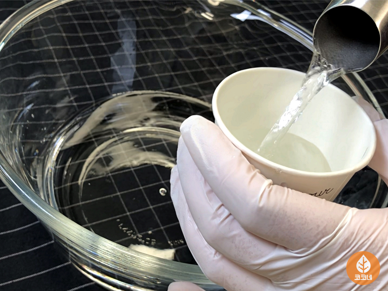 뜨거운물과 찬물을 1:4로 섞어요.