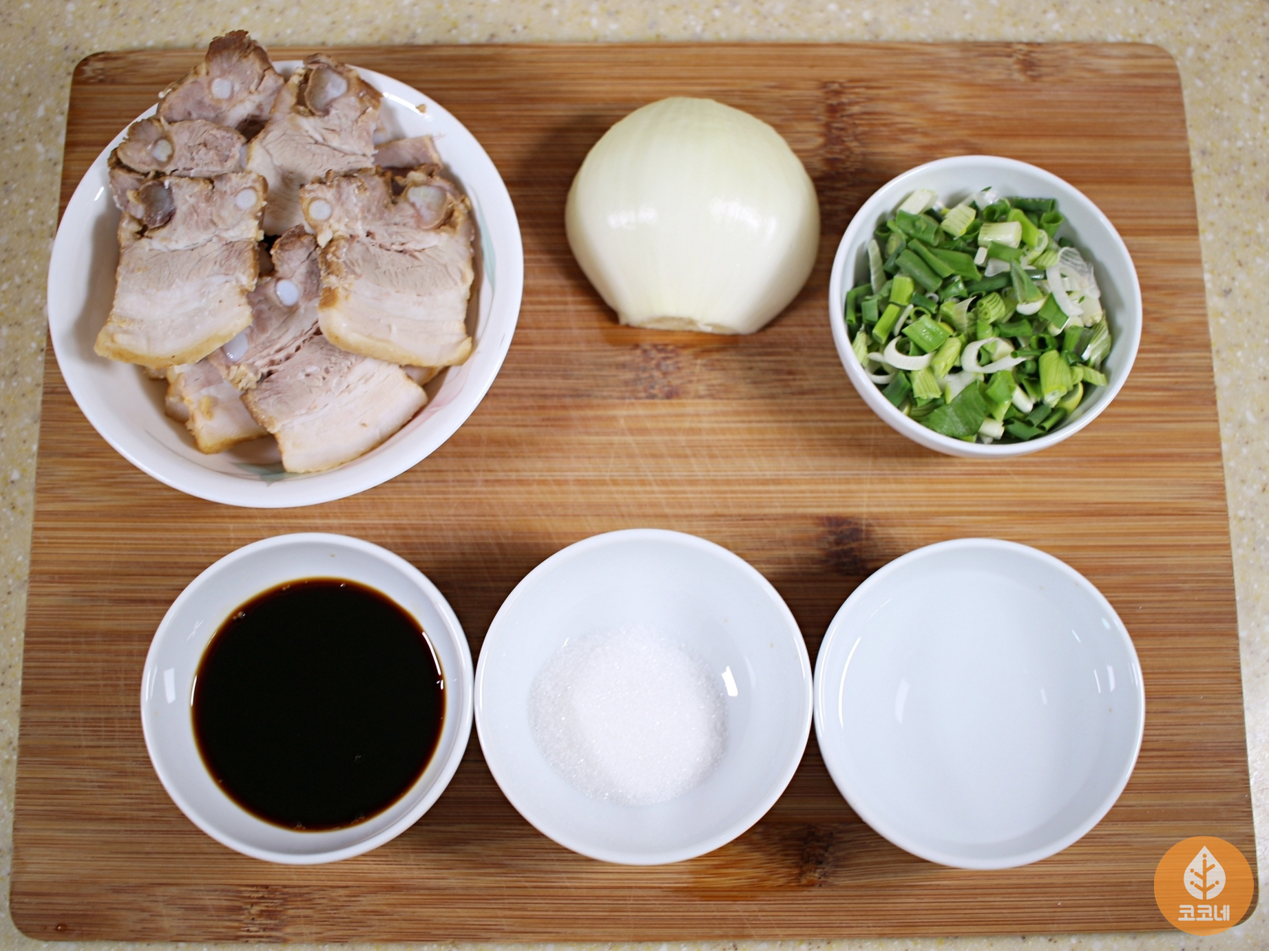 재료는 남은 보쌈고기, 양파, 쪽파, 간장, 설탕, 맛술 준비해요.