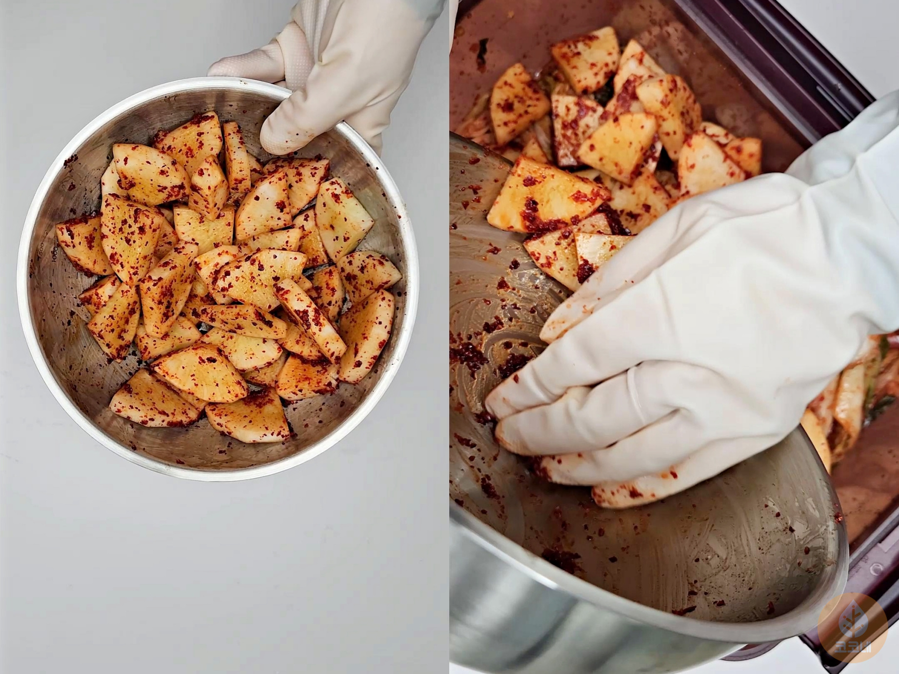 손질한 무에 고춧가루2, 매실액1 넣고 잘 버무려주세요.