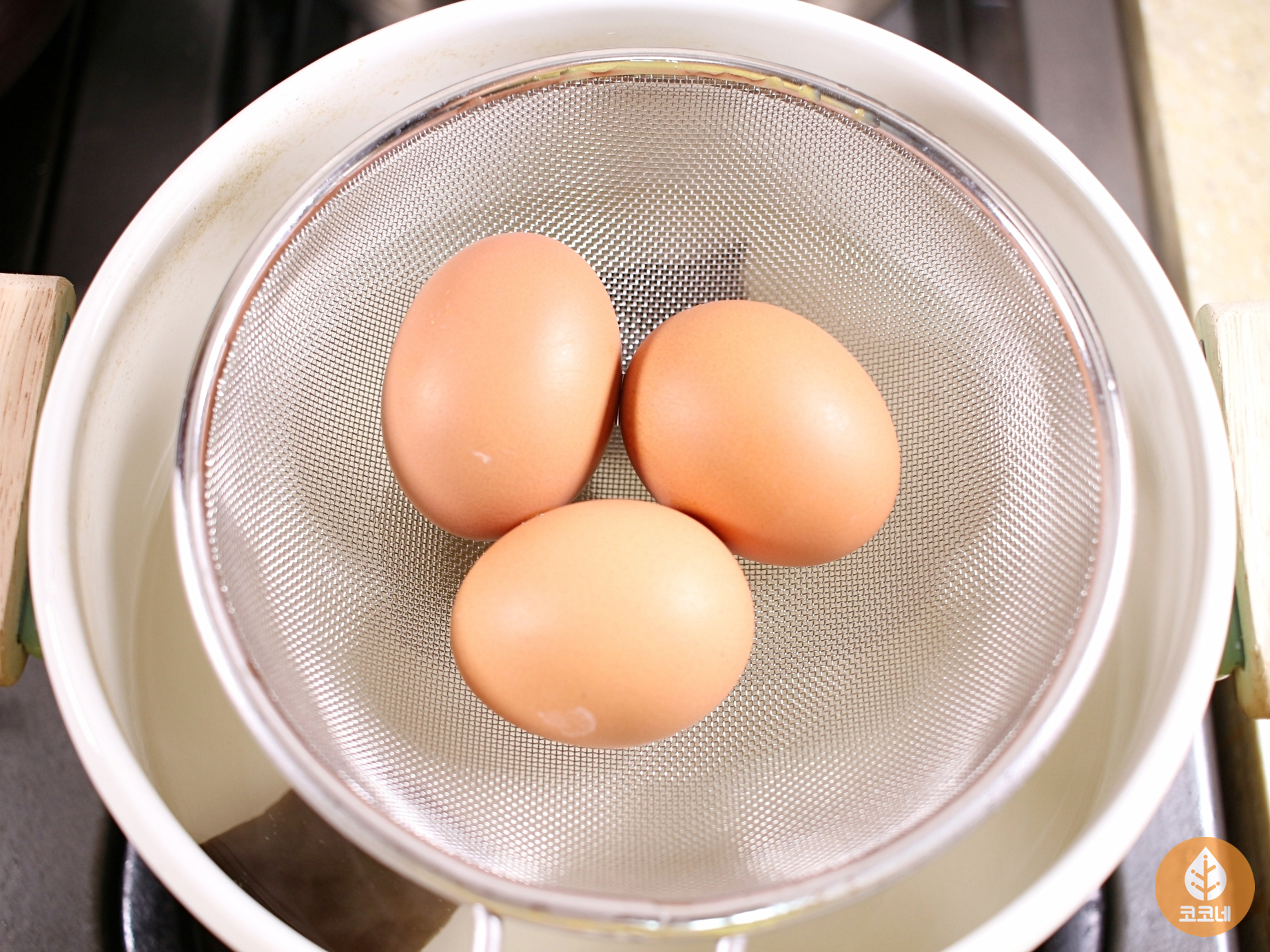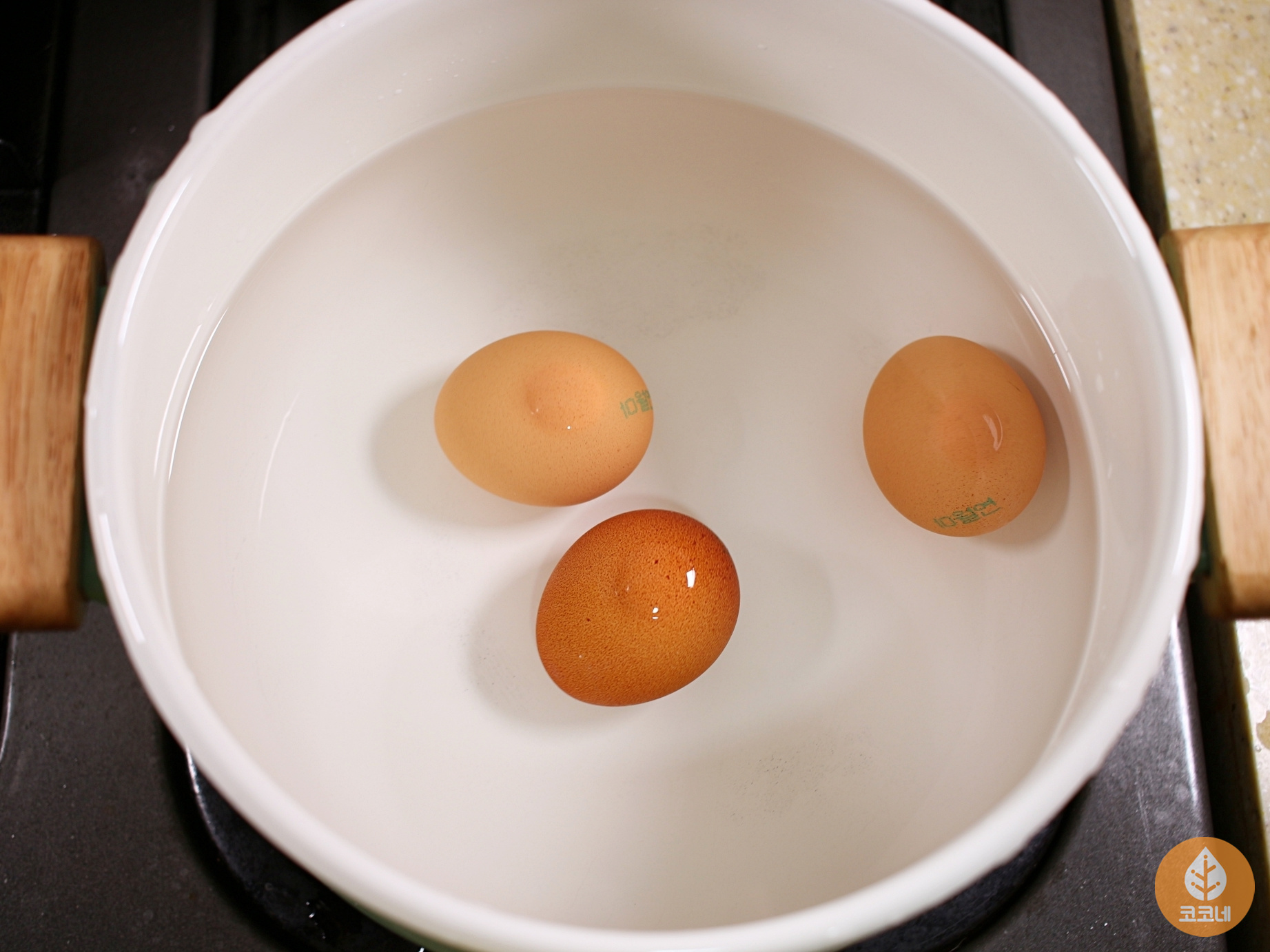 냄비에 물을 채우고 달걀을 넣어요.