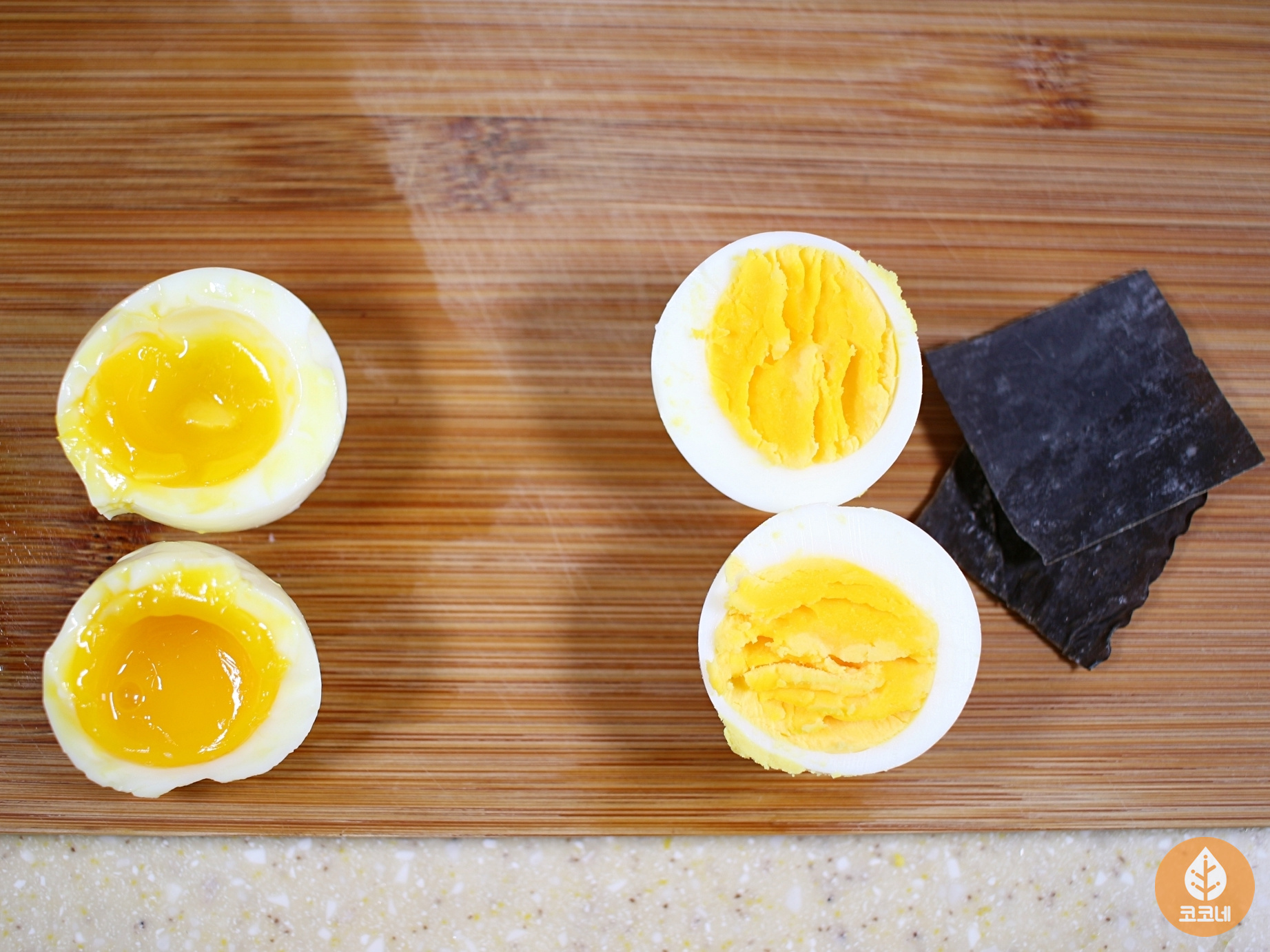 다시마 없이 삶은 달걀은 노른자가 흐를 정도의 반숙이고요.