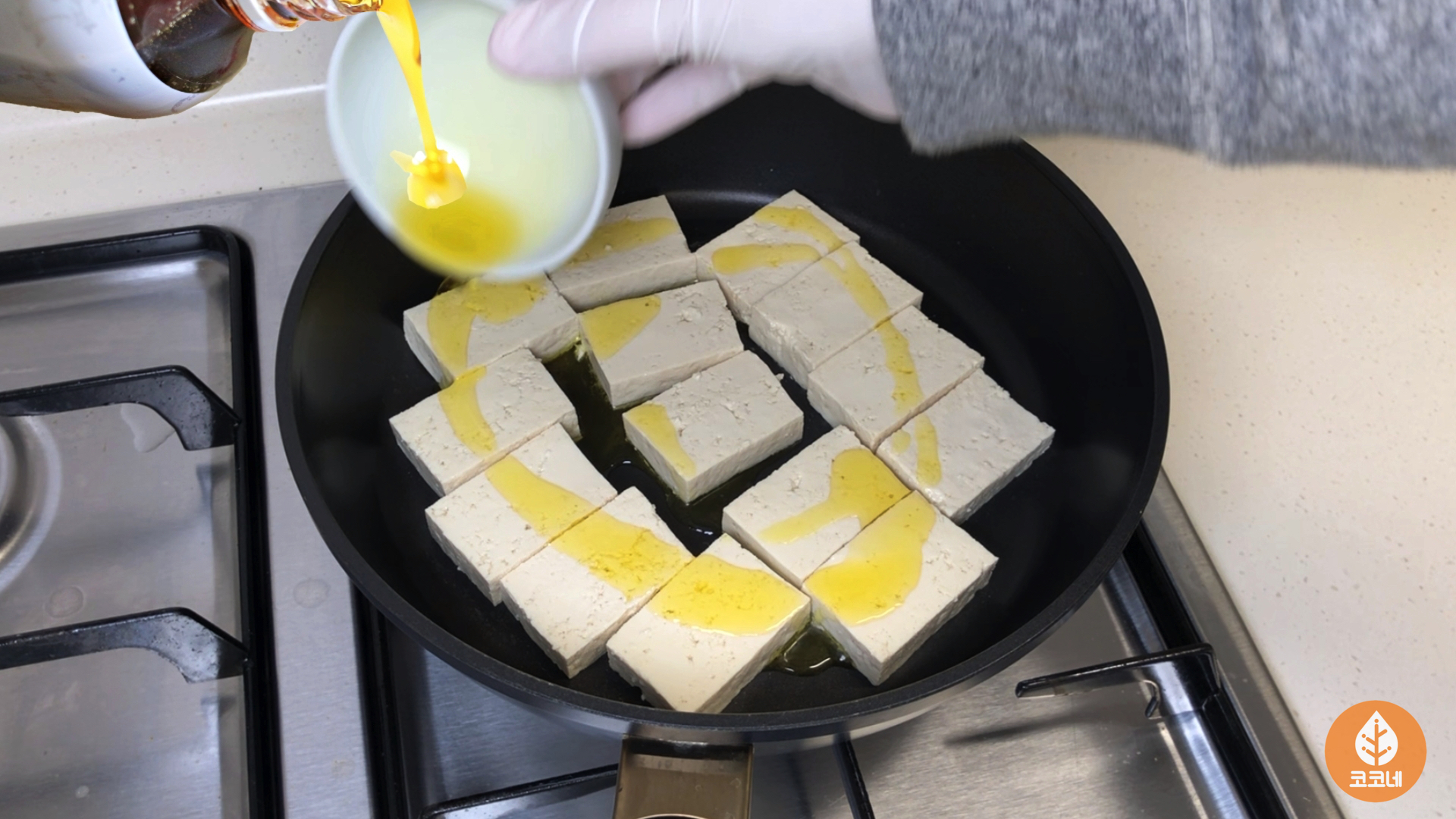 두부를 팬에 올리고 가스불을 켜면