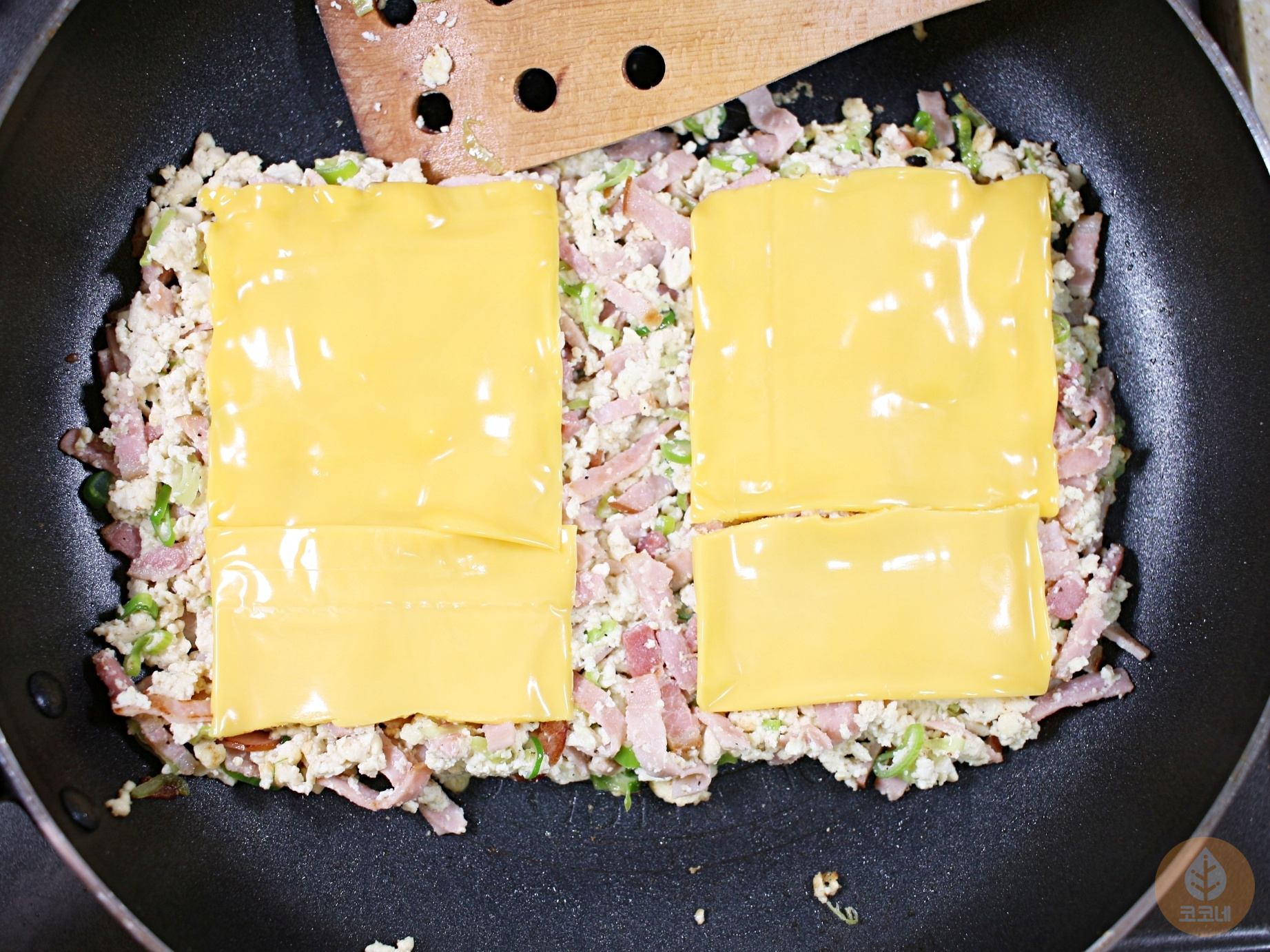 두부 스크램블을 네모 모양으로 다진 뒤에