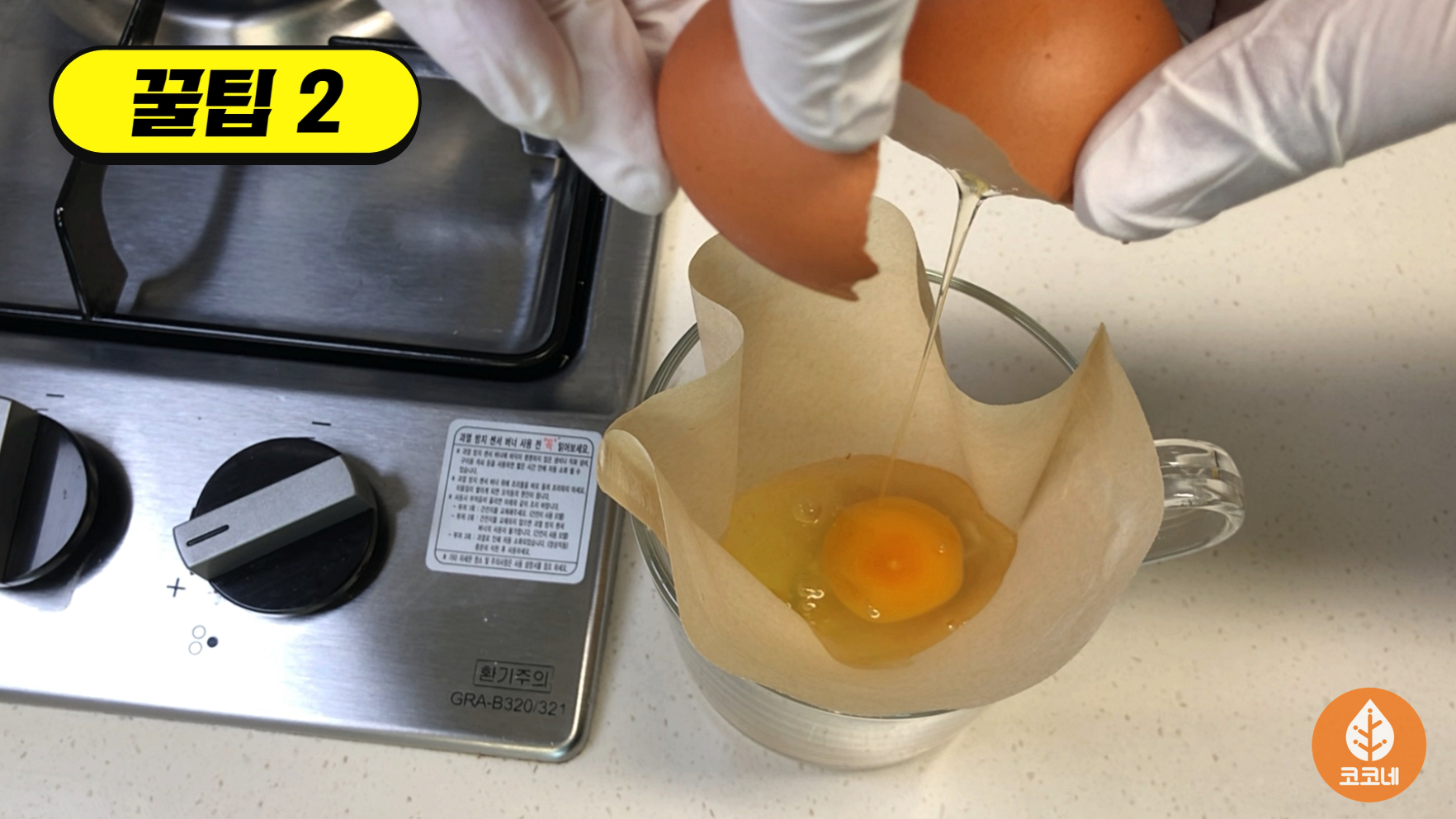 컵에 커피필터를 고정시키고 달걀을 터트려주세요.
