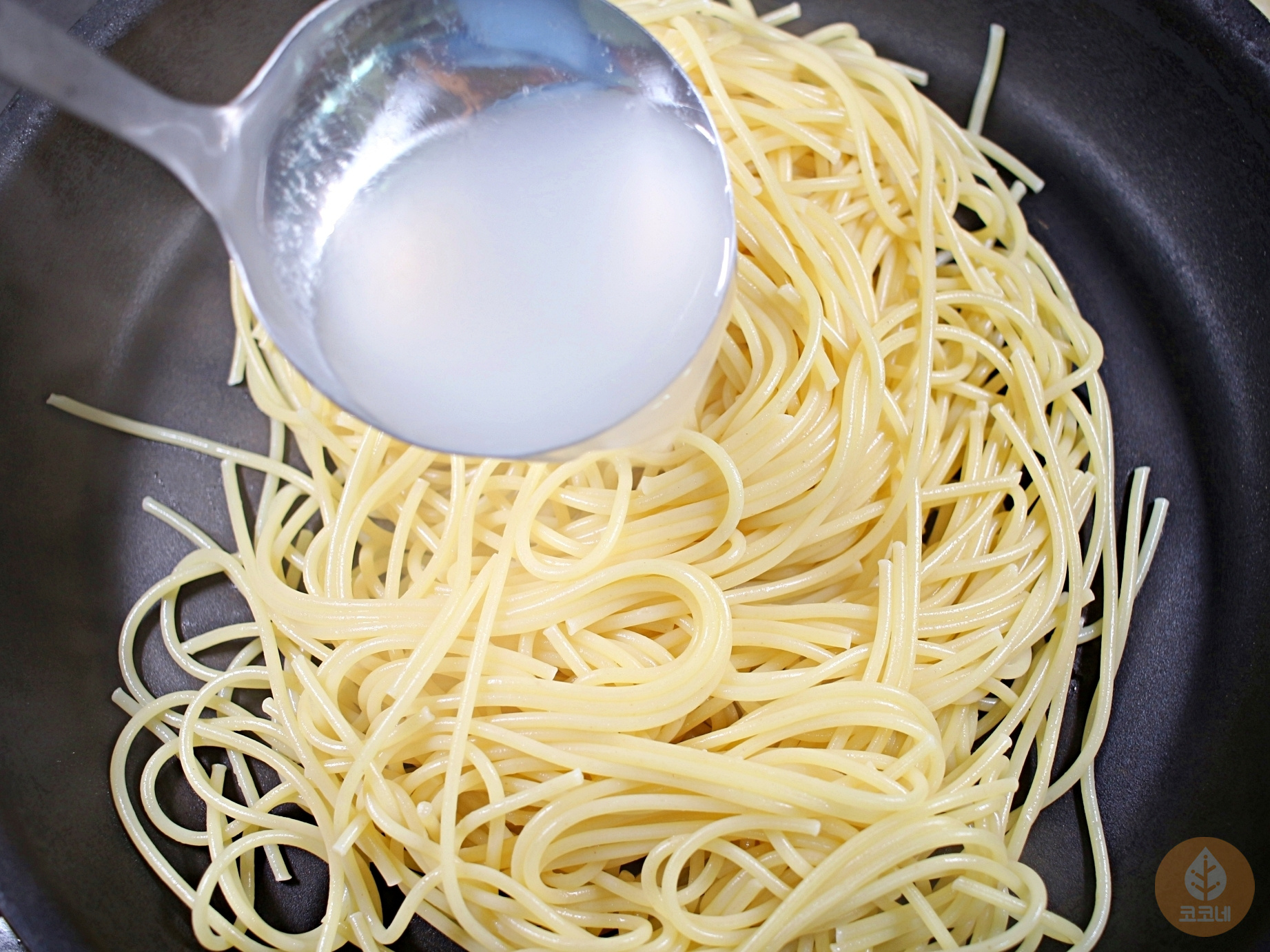 삶은 파스타면과 면수 한국자 넣어주세요.