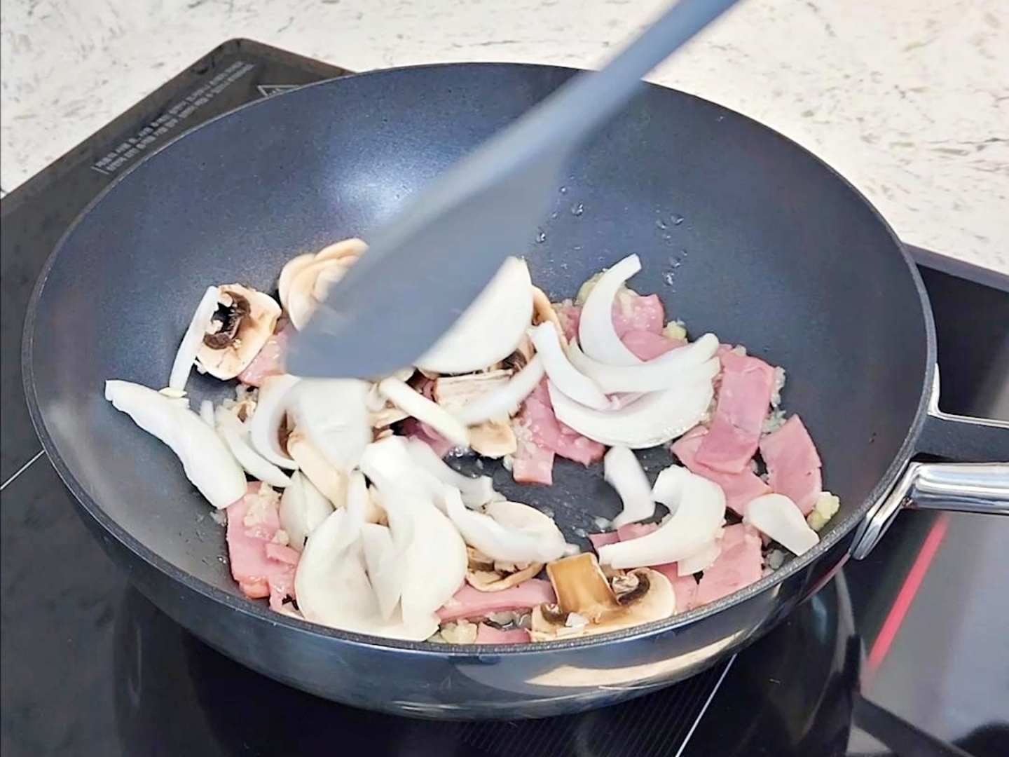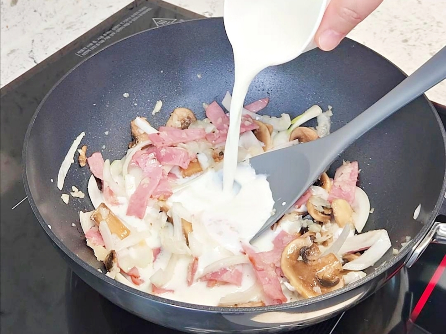 베이컨, 양파, 버섯을 차례로 넣고