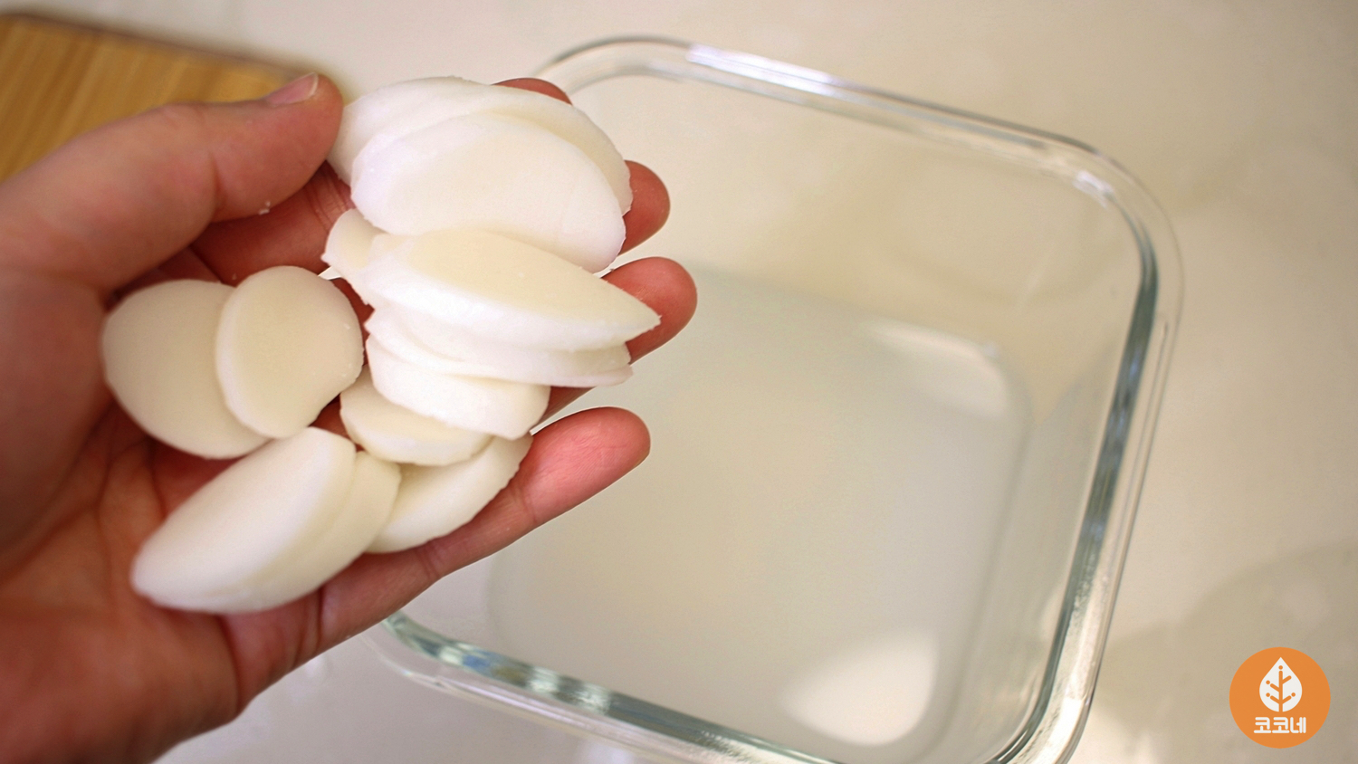 쌀뜨물에 떡국떡을 담그기만 하면 끝.