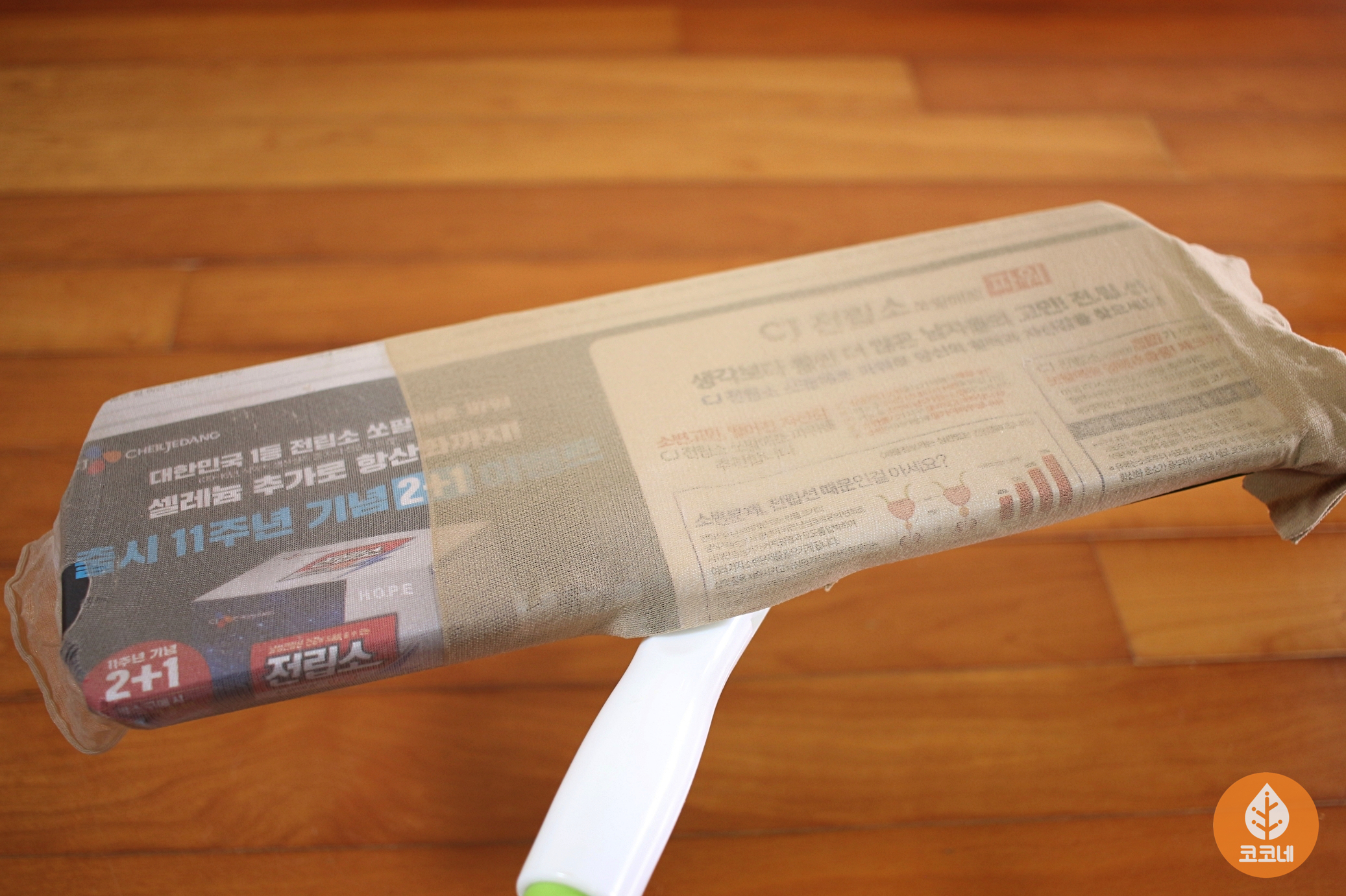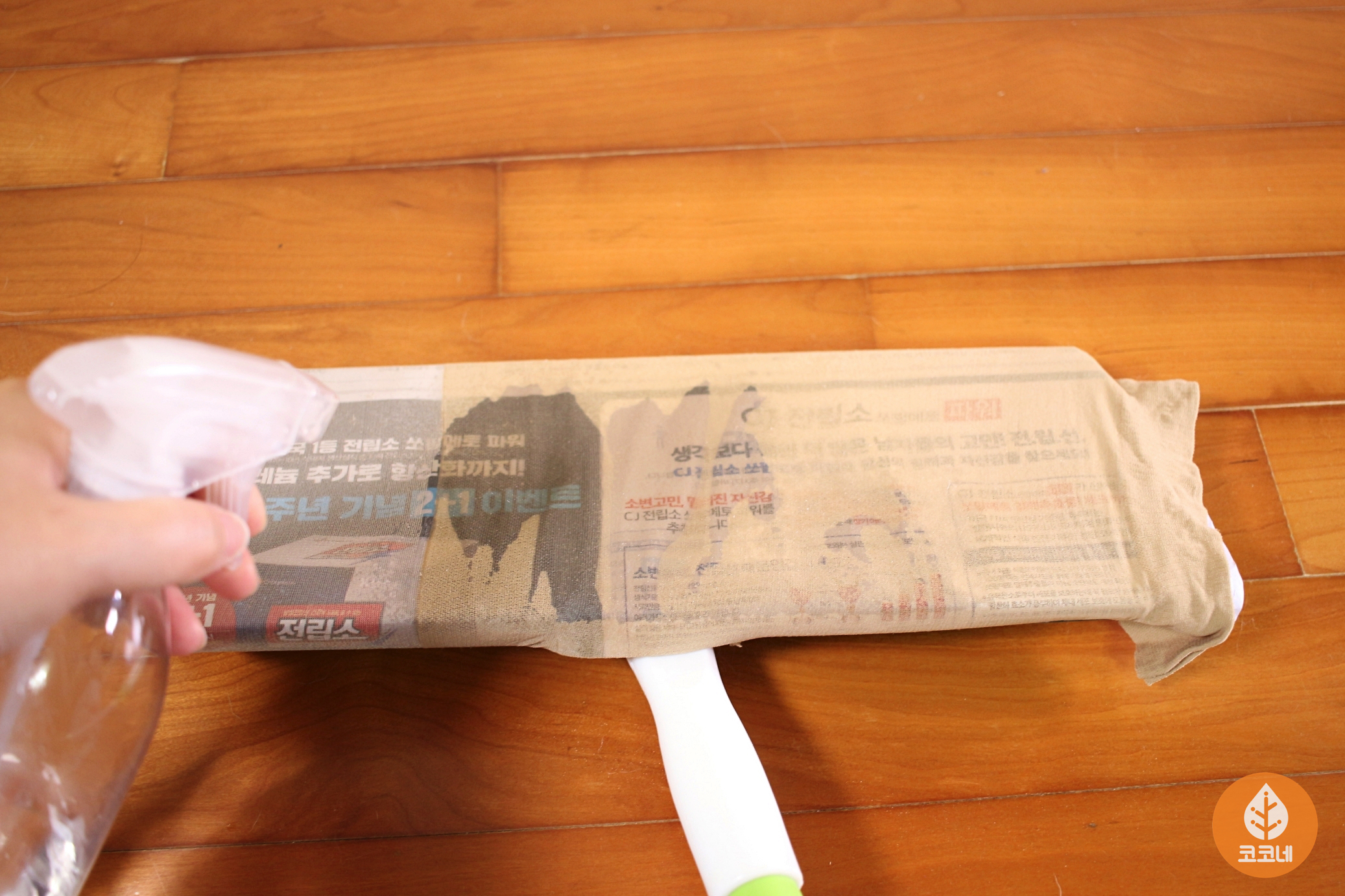 밀대에 신문지를 덧대 주시고요.