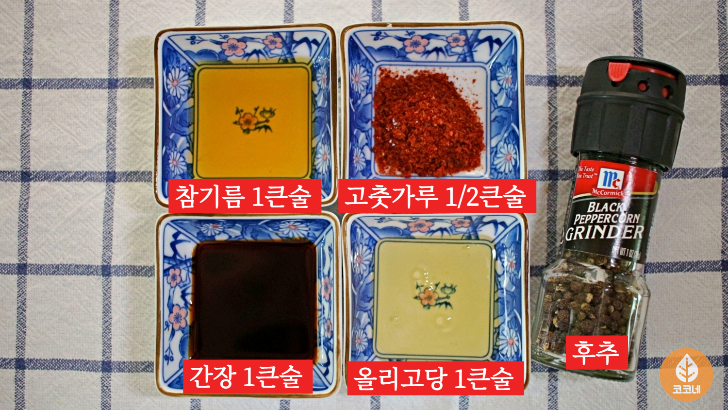 참기름 1큰술, 고춧가루 1/2큰술, 후추에요.