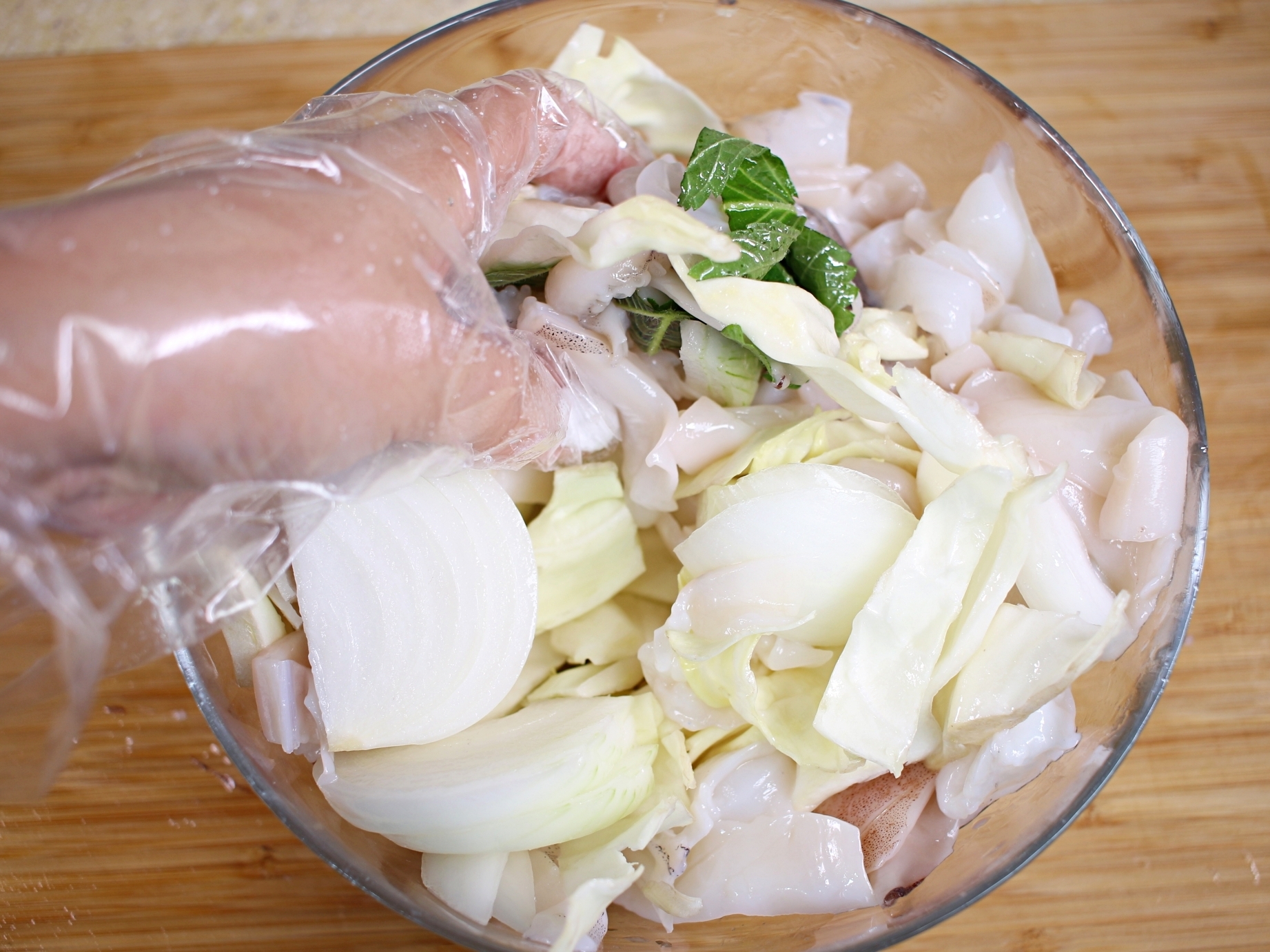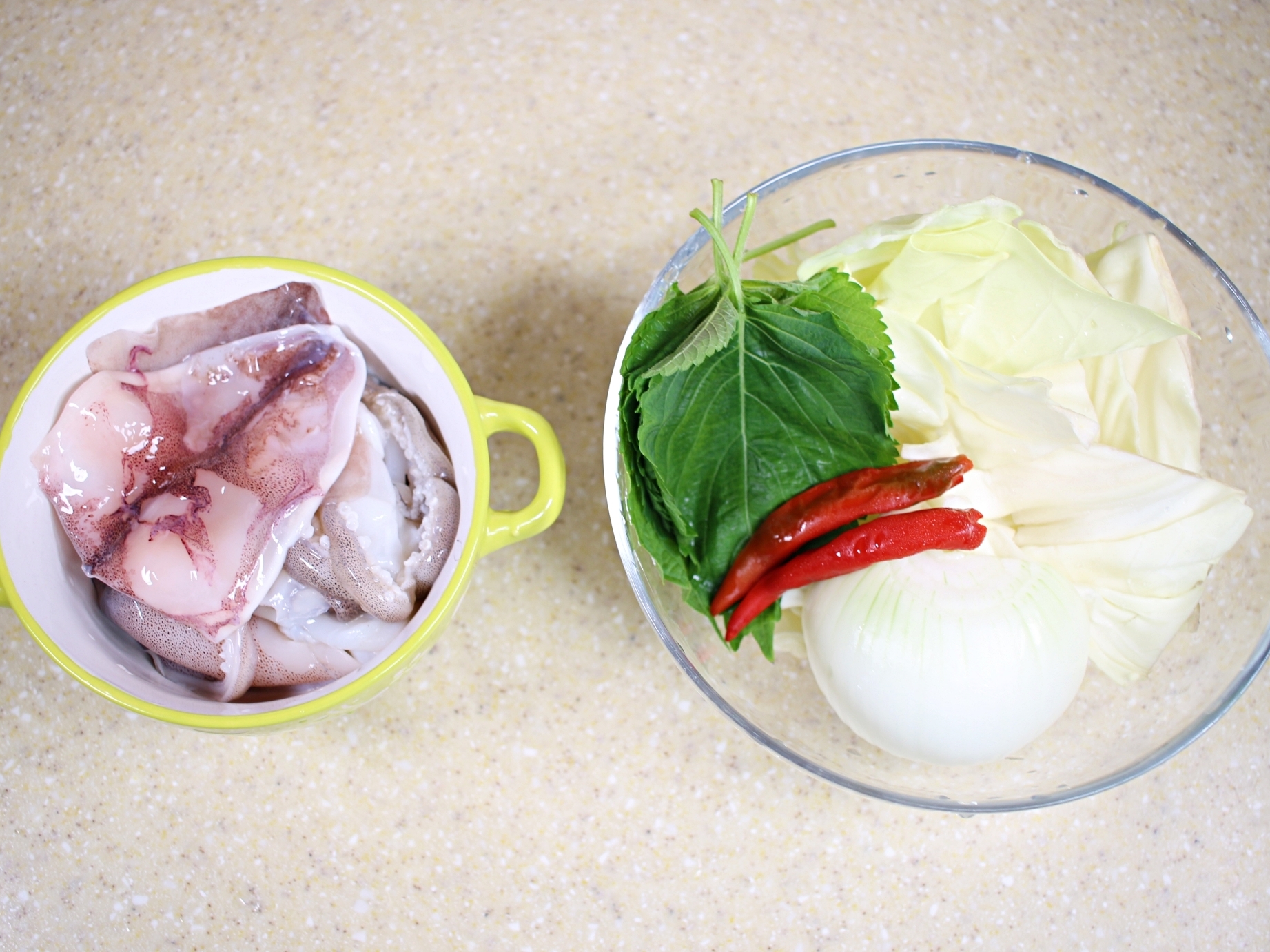 큼직한 내열용기에 오징어와 야채를 담고요.