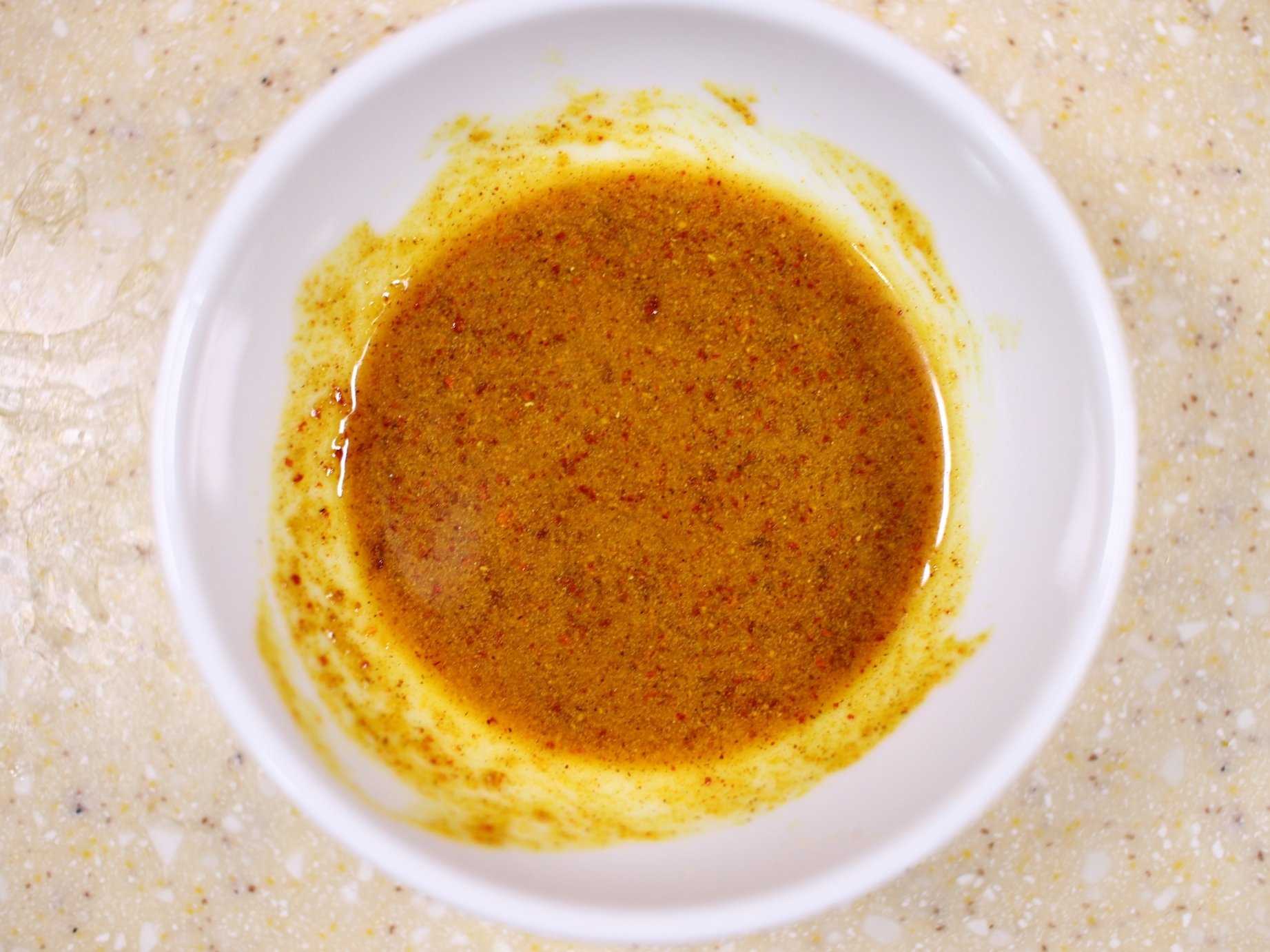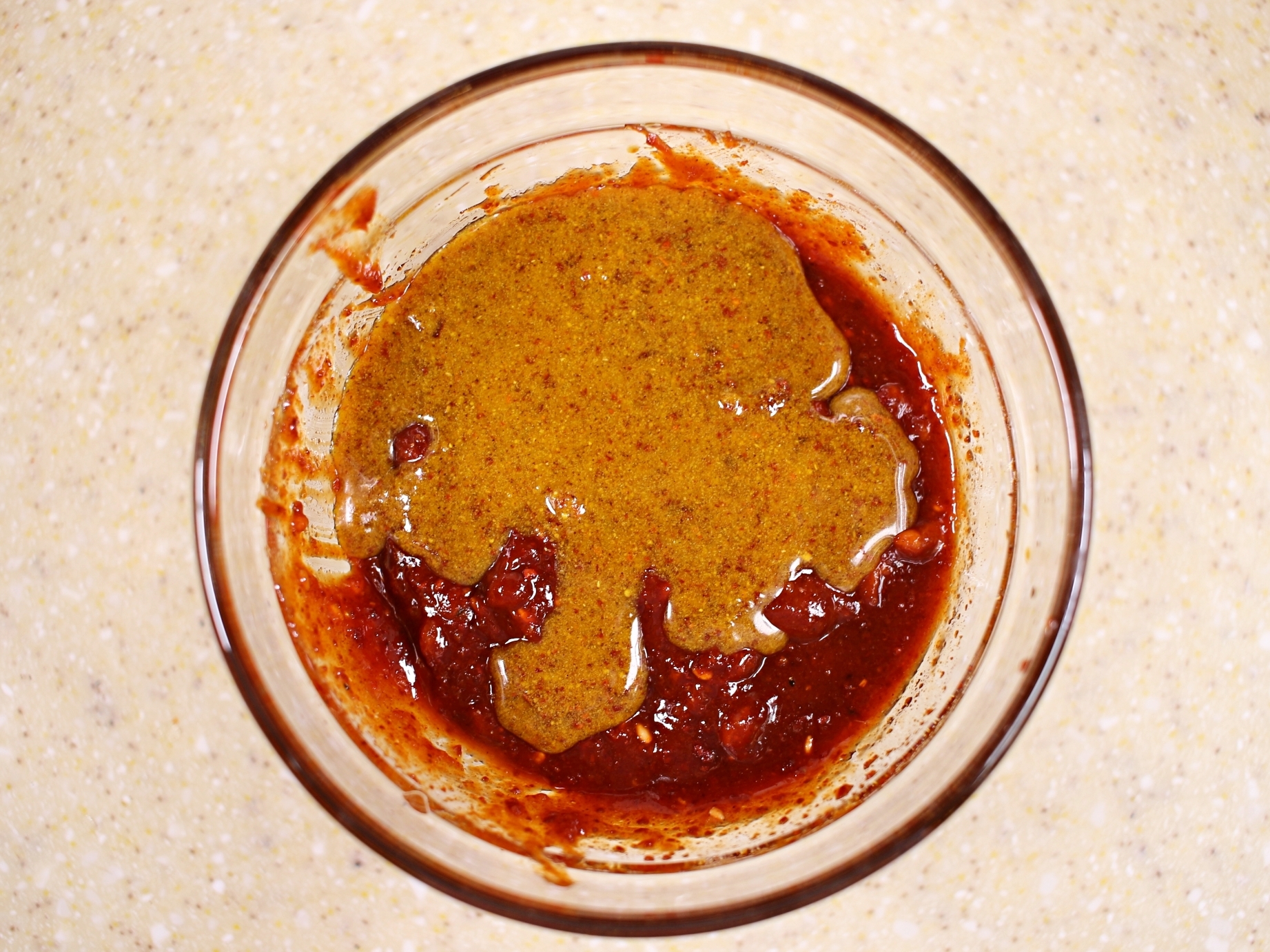 식용유 1.5큰술, 고춧가루1/4큰술, 카레가루1.5큰술을 섞어서