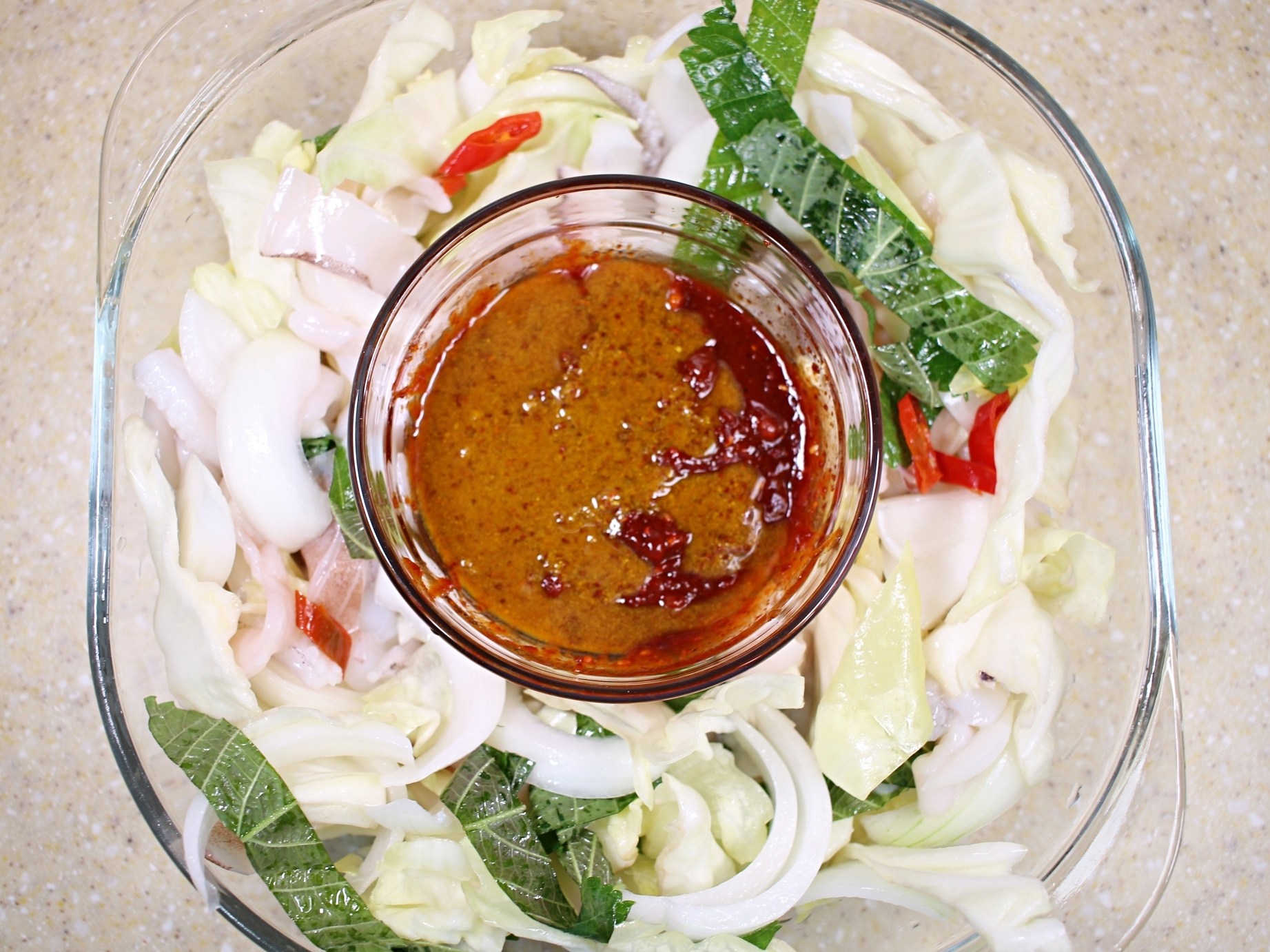 야채는 양파, 양배추, 깻잎, 홍고추 준비했어요.