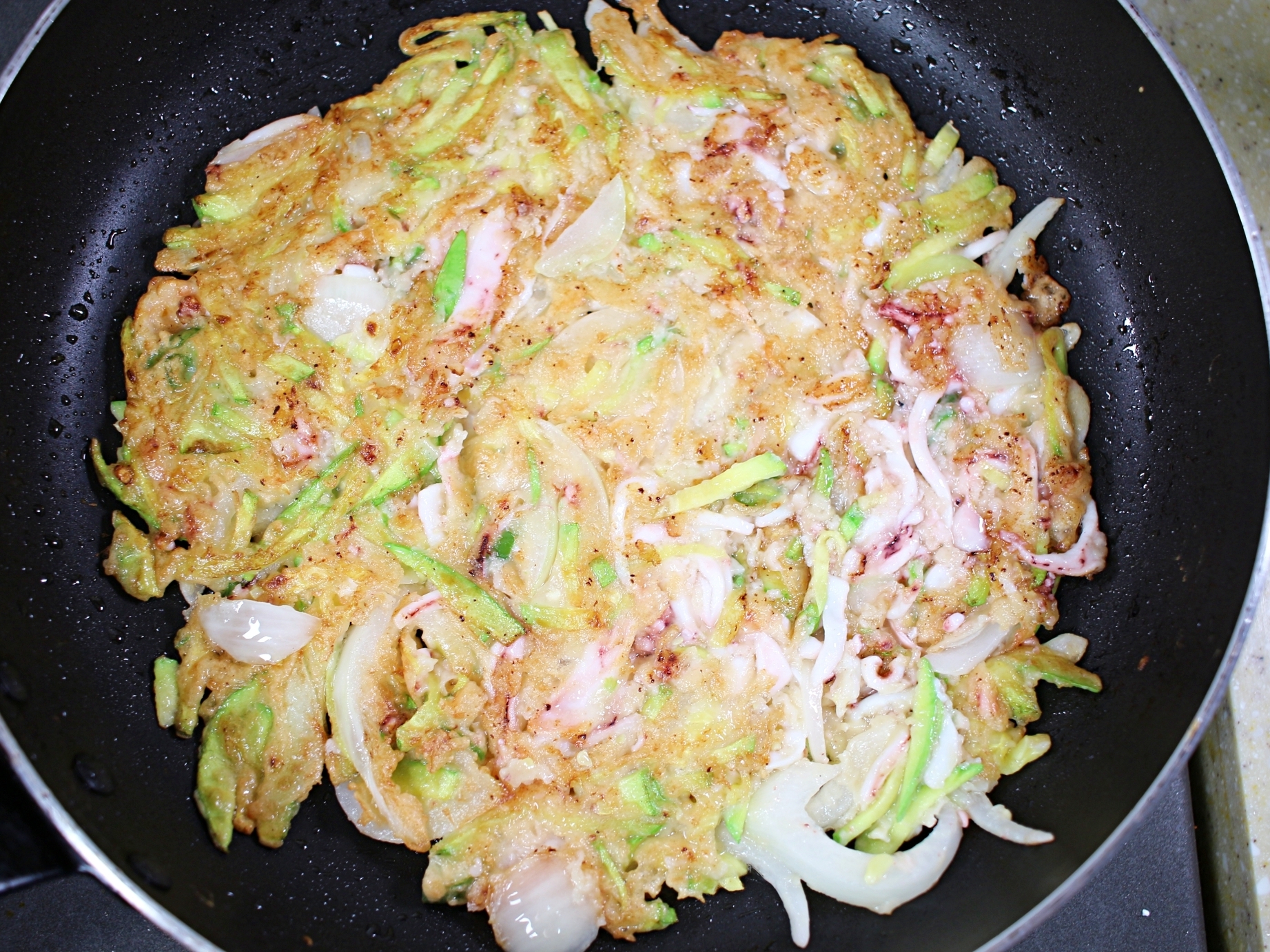 재료는 애호박, 오징어, 양파, 부침가루, 청양고추, 계란.
