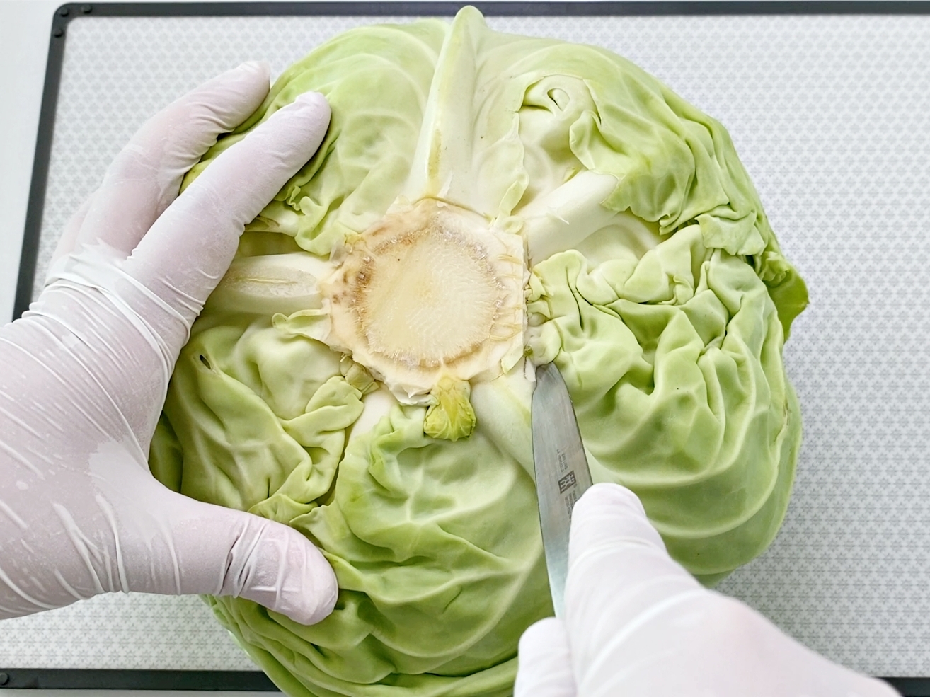먼저 양배추 밑동의 심지 부분을 도려내 주세요.