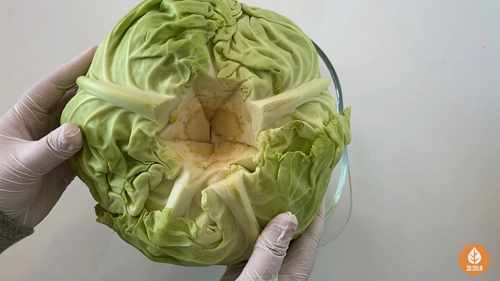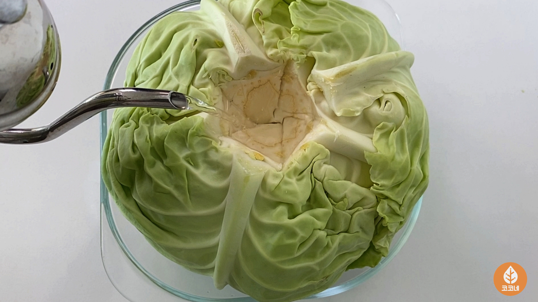 양배추의 심지 부분에 따뜻한 물을 부어주면