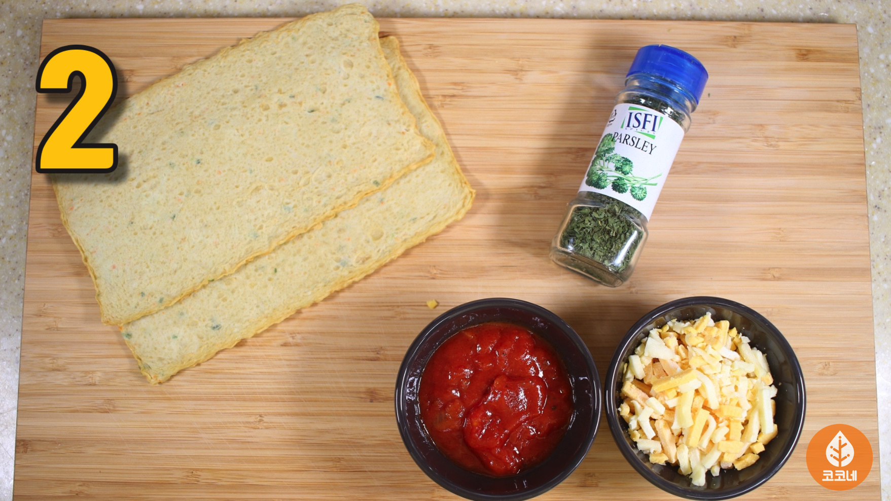 사각어묵, 모짜렐라치즈, 토마토소스, 파슬리가루.
