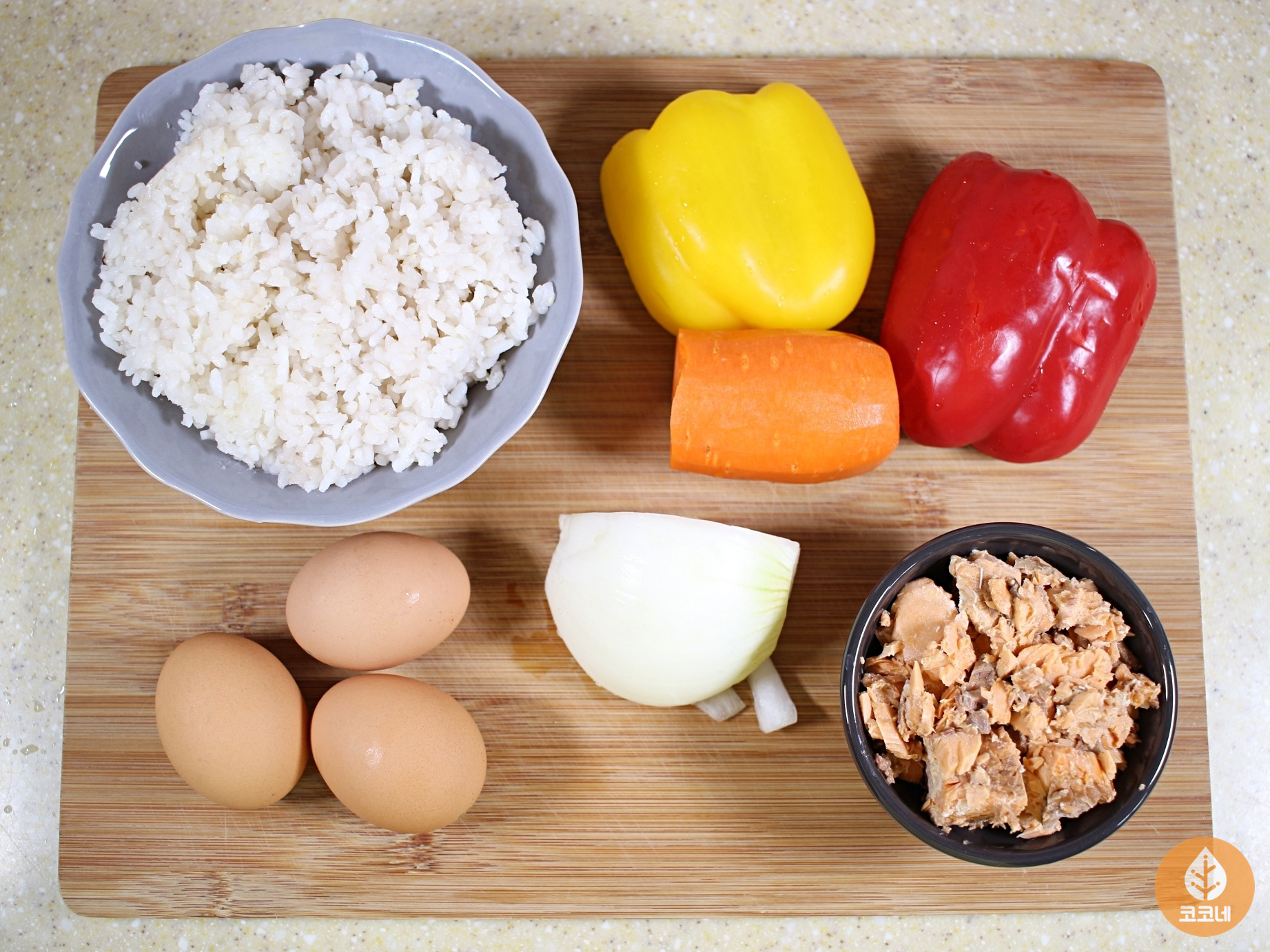 재료는 연어캔, 찬밥, 달걀, 파프리카, 양파, 당근 준비했어요.