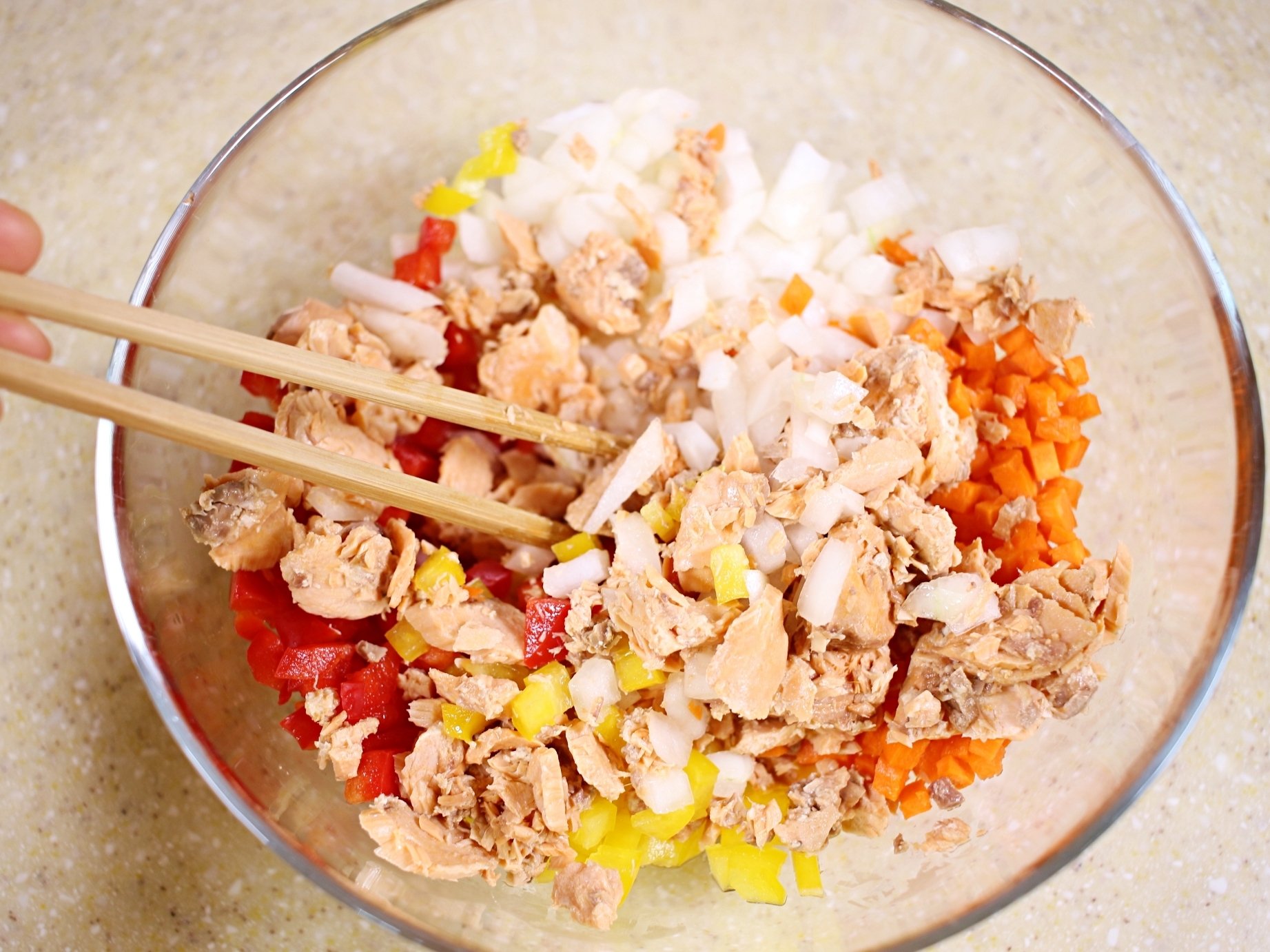 재료는 연어캔, 찬밥, 달걀, 파프리카, 양파, 당근 준비했어요.