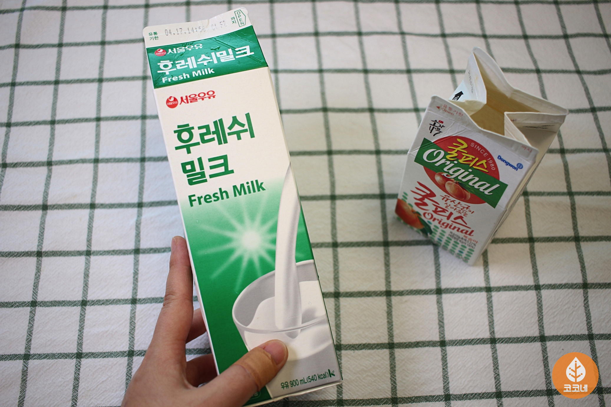 깨끗하게 세척한 우유갑을 펼쳐주세요.