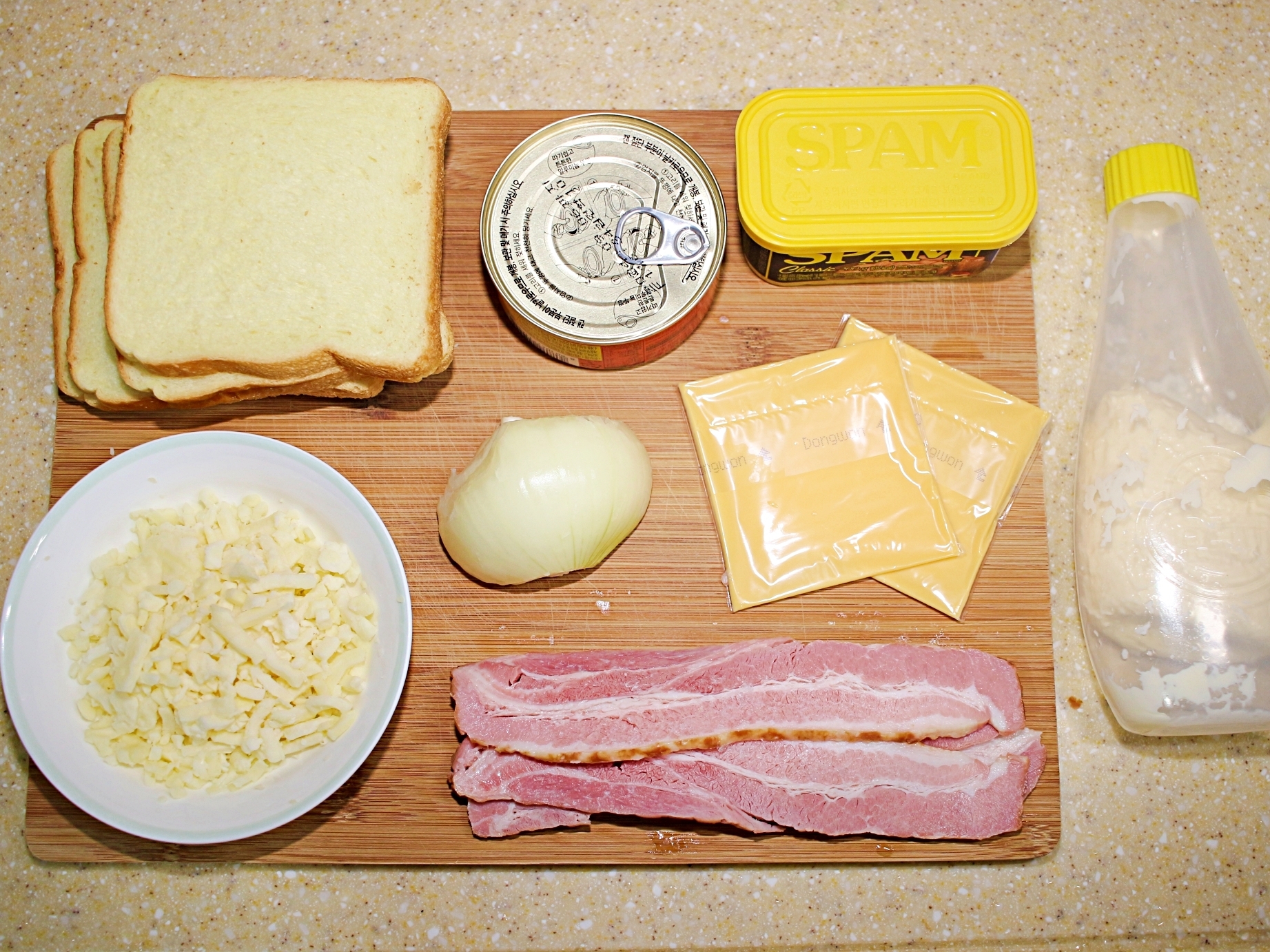 재료는 베이컨, 식빵, 모짜렐라치즈, 참치캔, 양파, 스팸,