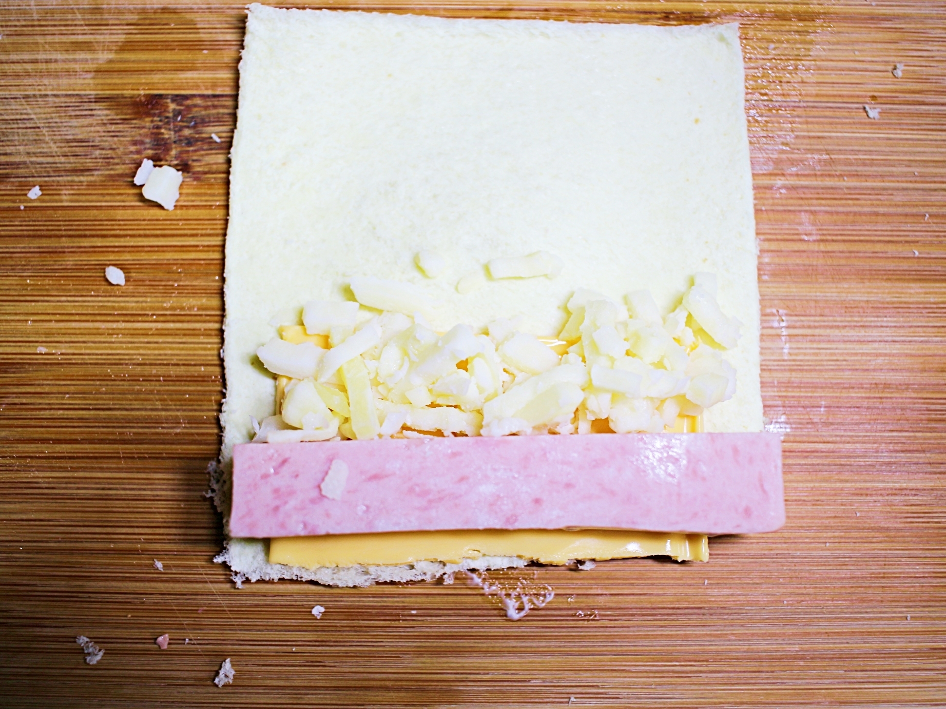 납작한 식빵 위에 슬라이스치즈, 스팸, 모짜렐라치즈 올리고