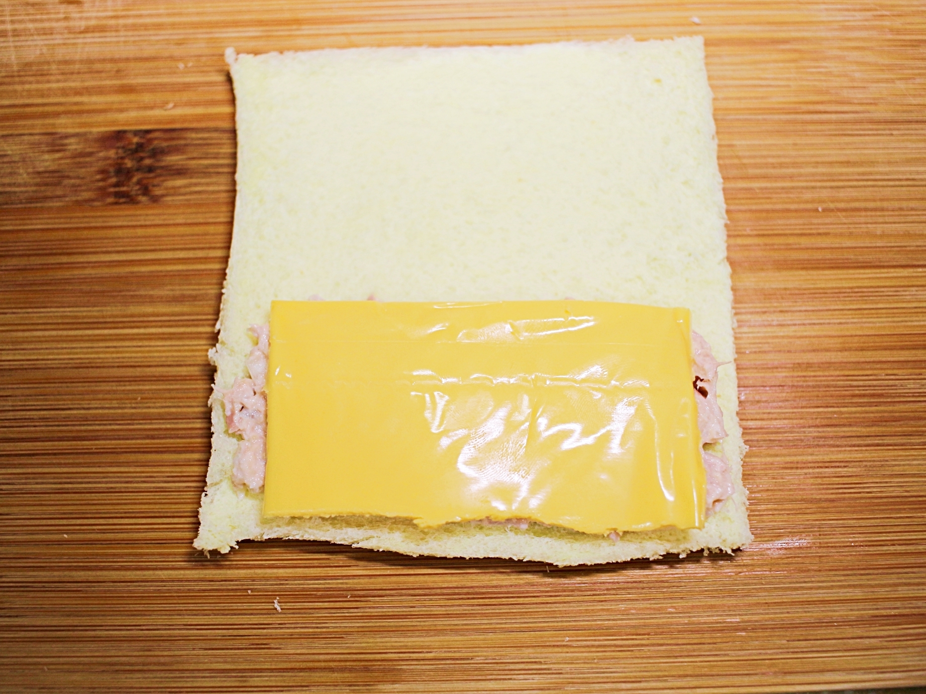 식빵 위에 참치마요, 슬라이스치즈 올려서 돌돌 말고