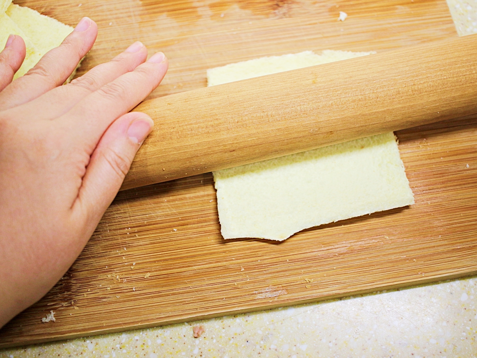 식빵의 테두리를 잘라낸 뒤 밀대로 납작하게 밀어주세요.