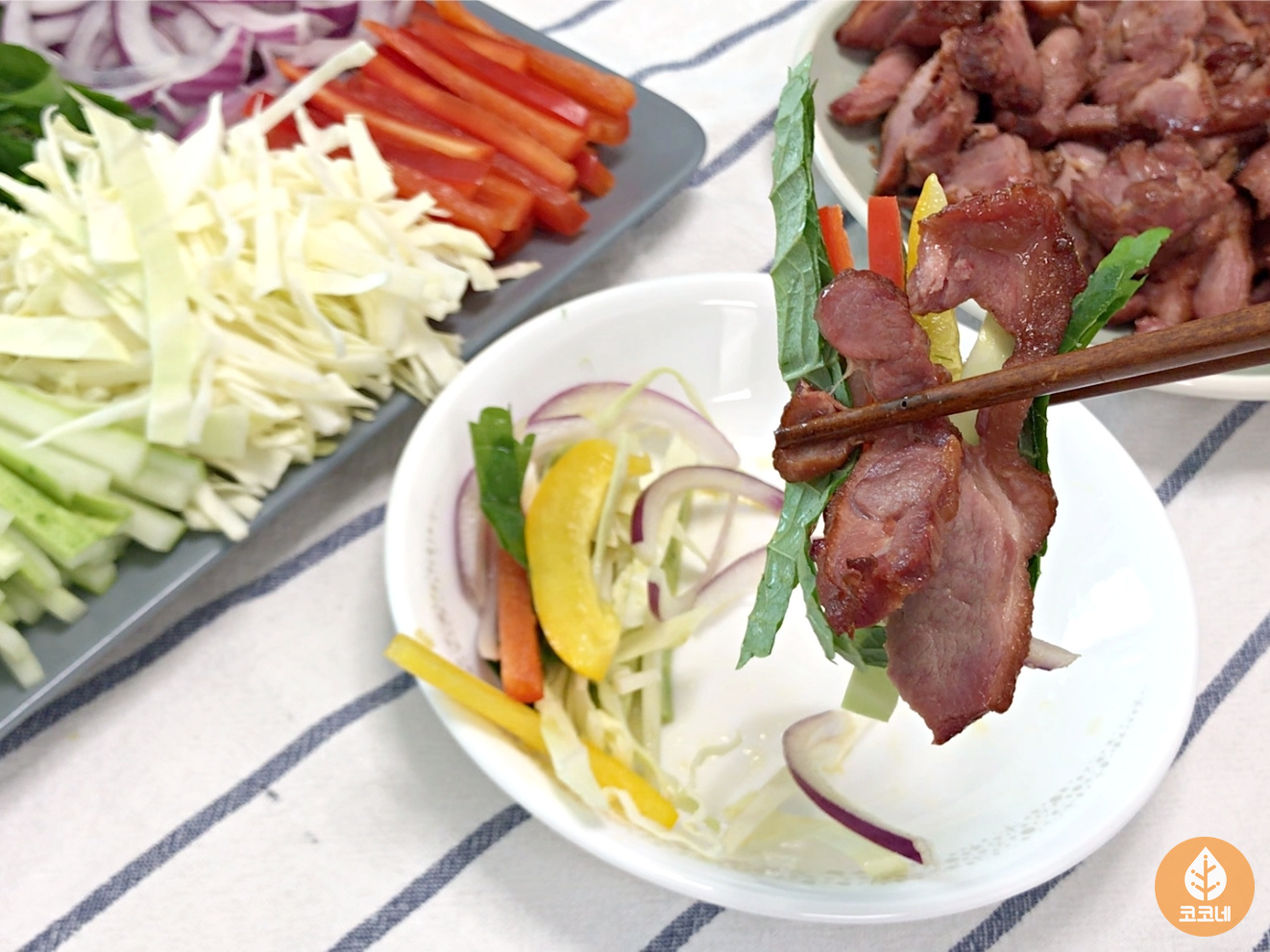 재료는 훈제오리, 파프리카, 양파, 오이, 양배추, 깻잎.