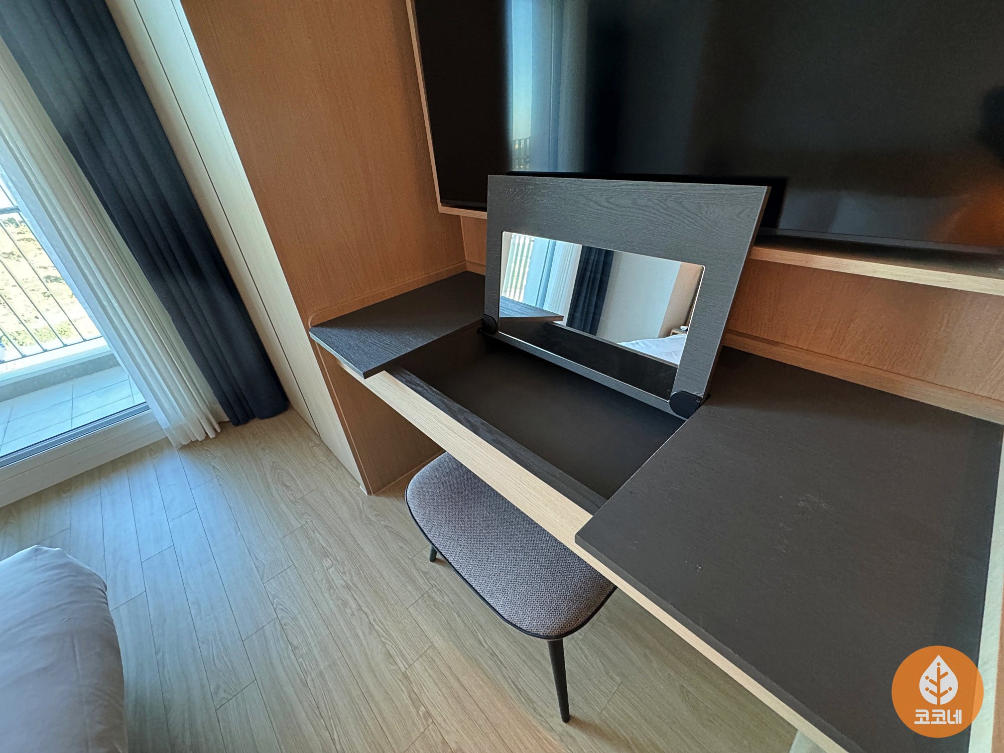침대 맞은편에는 벽걸이 TV와 화장대가 있는데요.