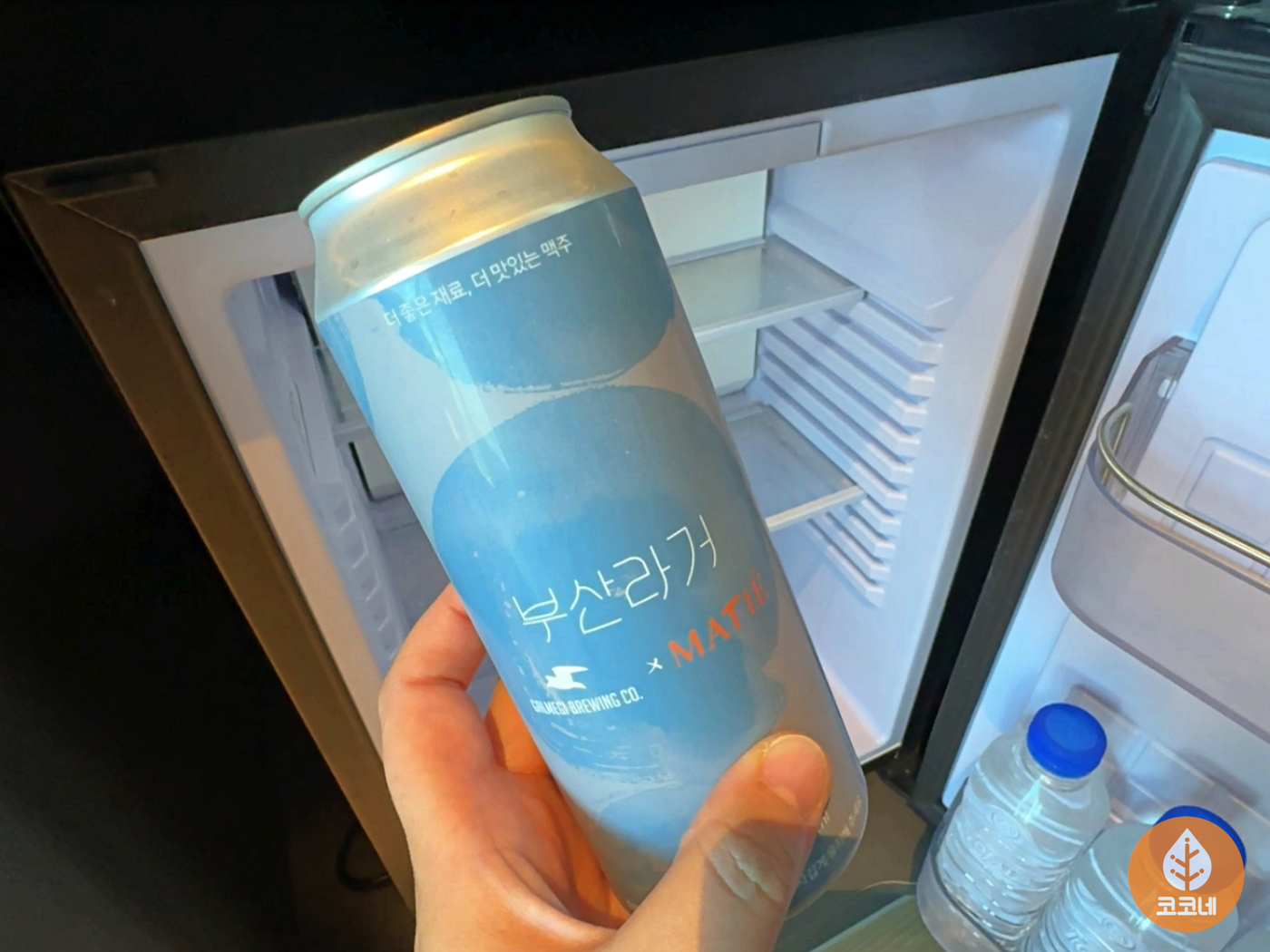 그 아래 문을 열면 미니 냉장고가 있어요.