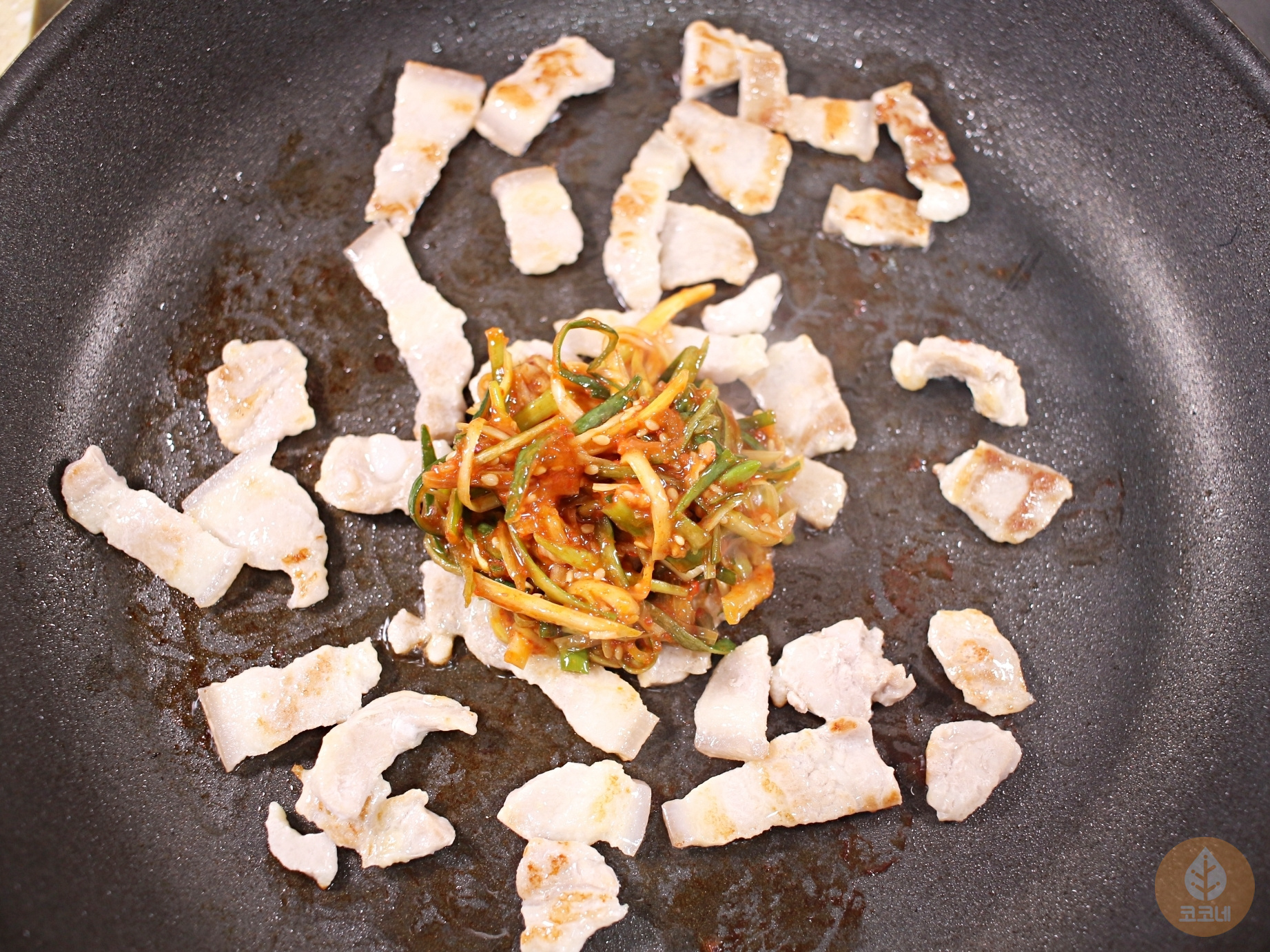 후라이팬에 삼겹살 먼저 구워주세요.