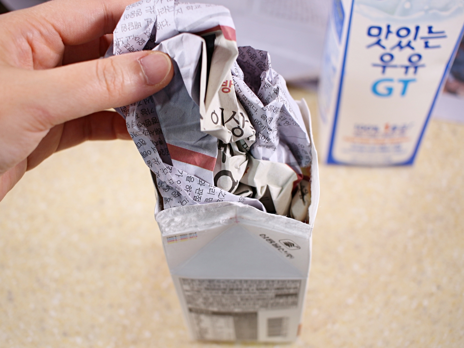 빈 우유갑 안에 신문지를 구겨 넣어주세요.