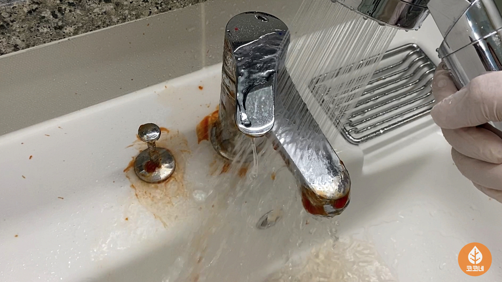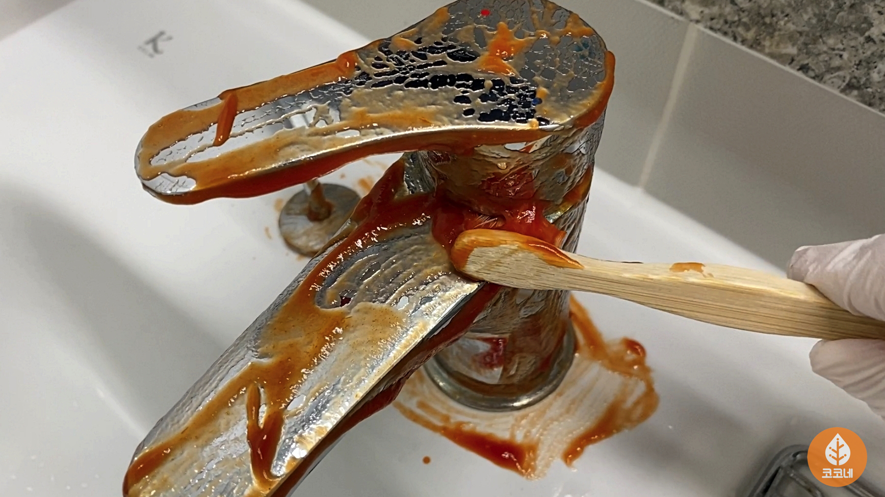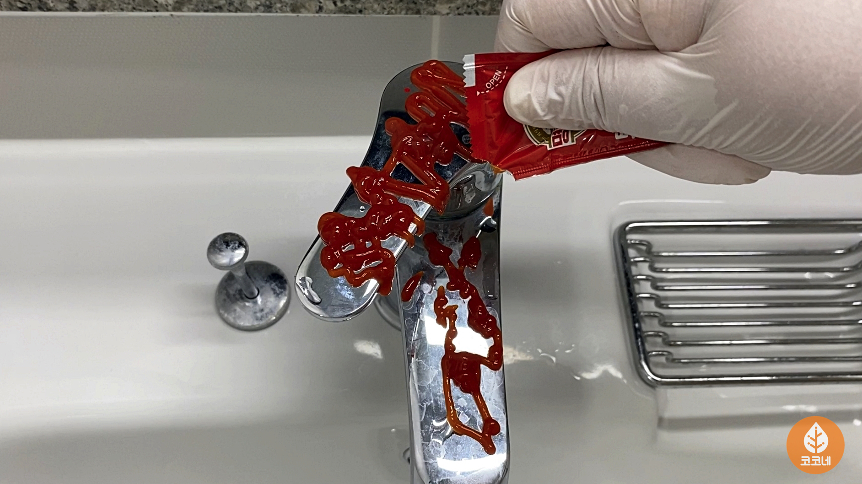 수도꼭지에 일회용케첩을 듬뿍 뿌려주세요.