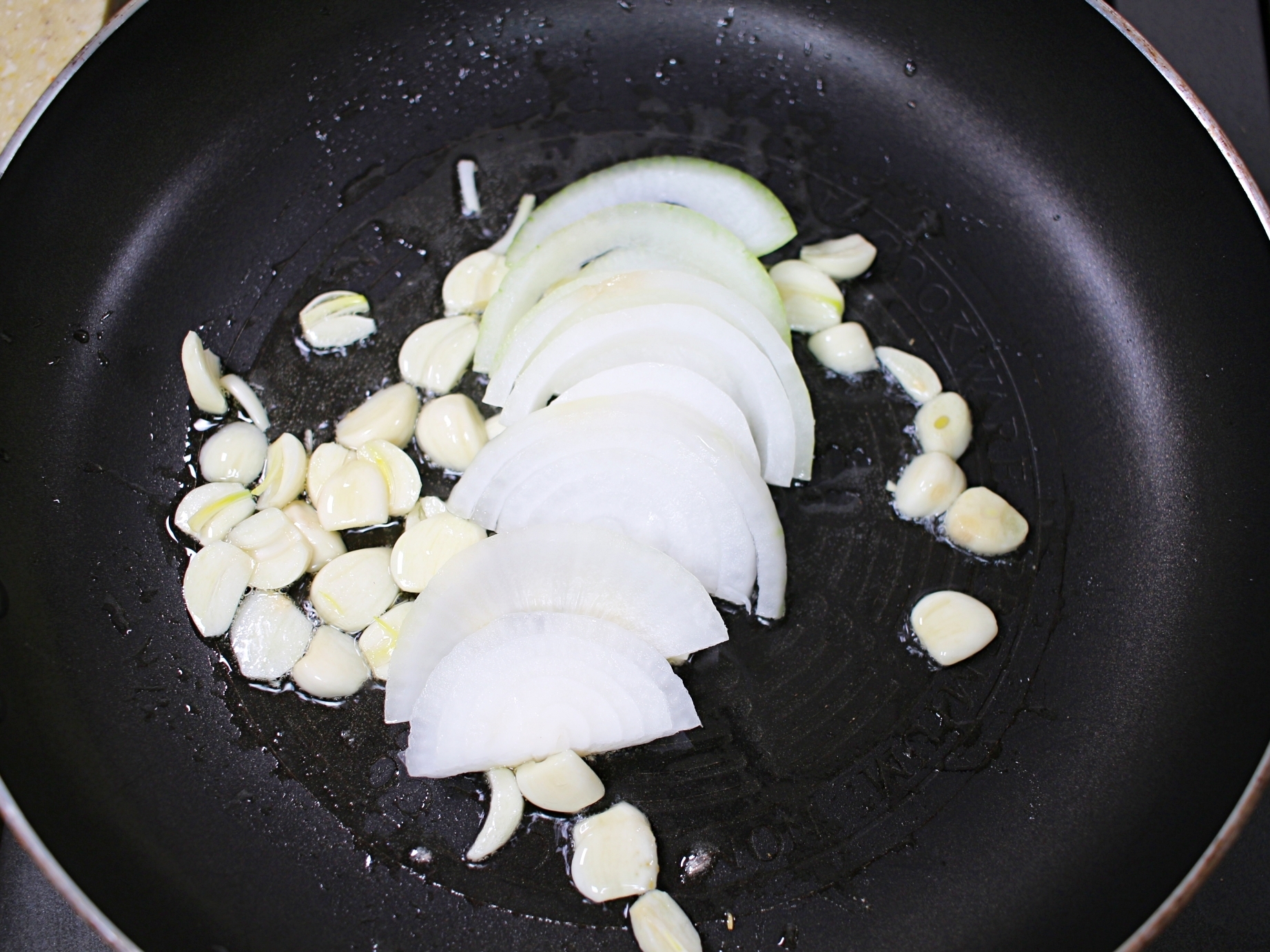 마늘향이 충분히 올라오면 양파를 넣고 볶아주세요.
