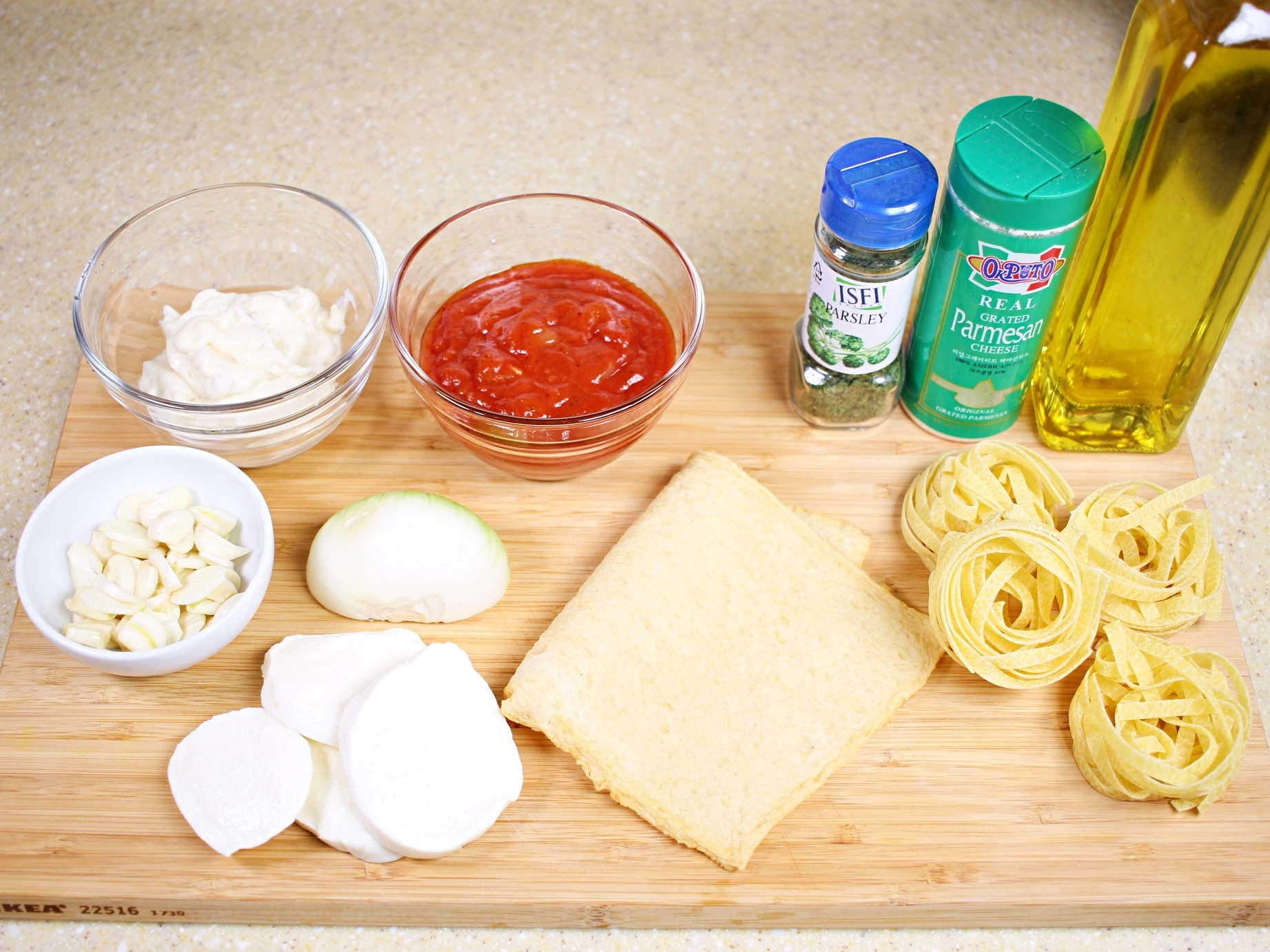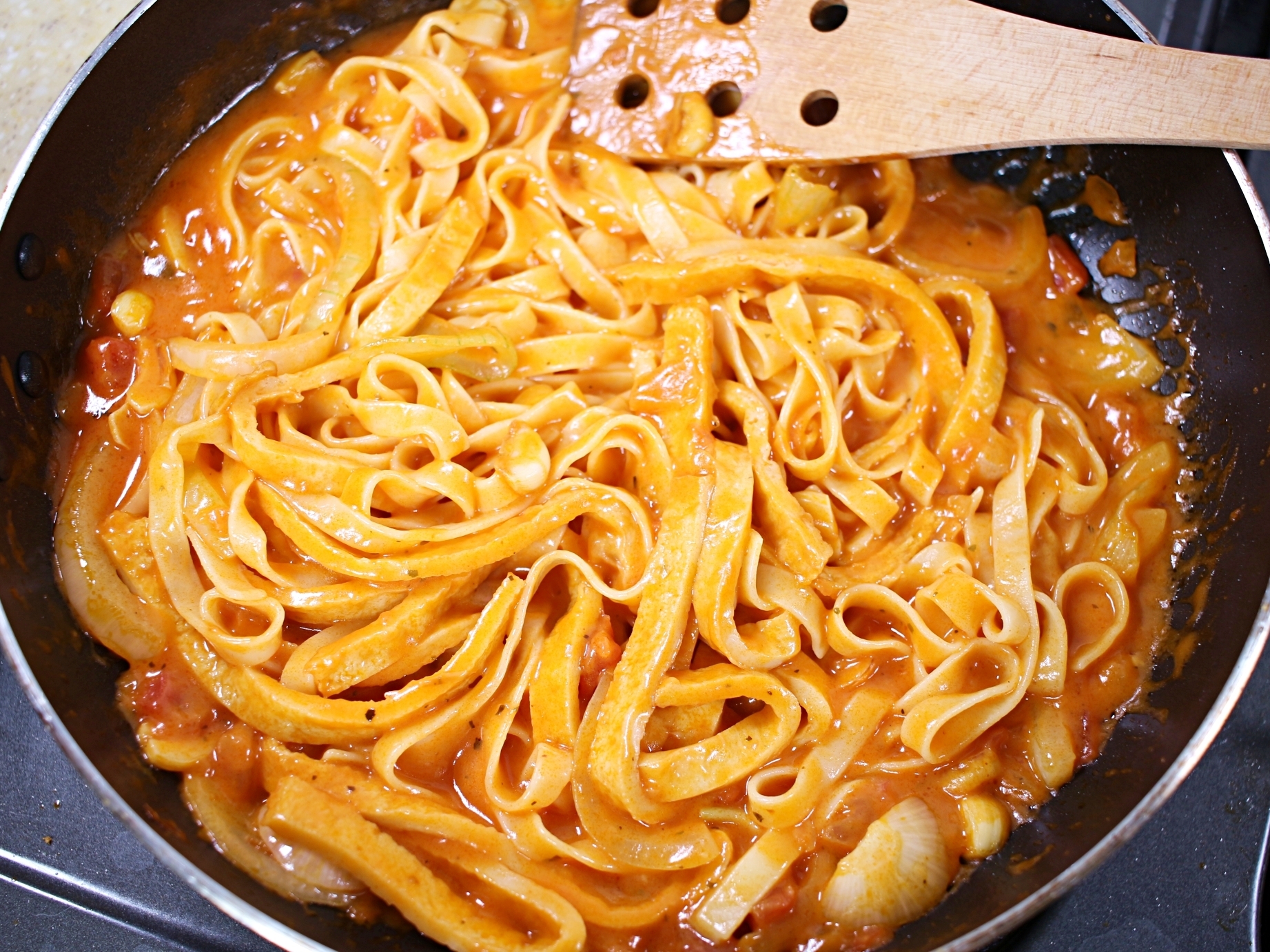 재료는 파스타면, 사각어묵, 토마토소스, 마늘, 양파,