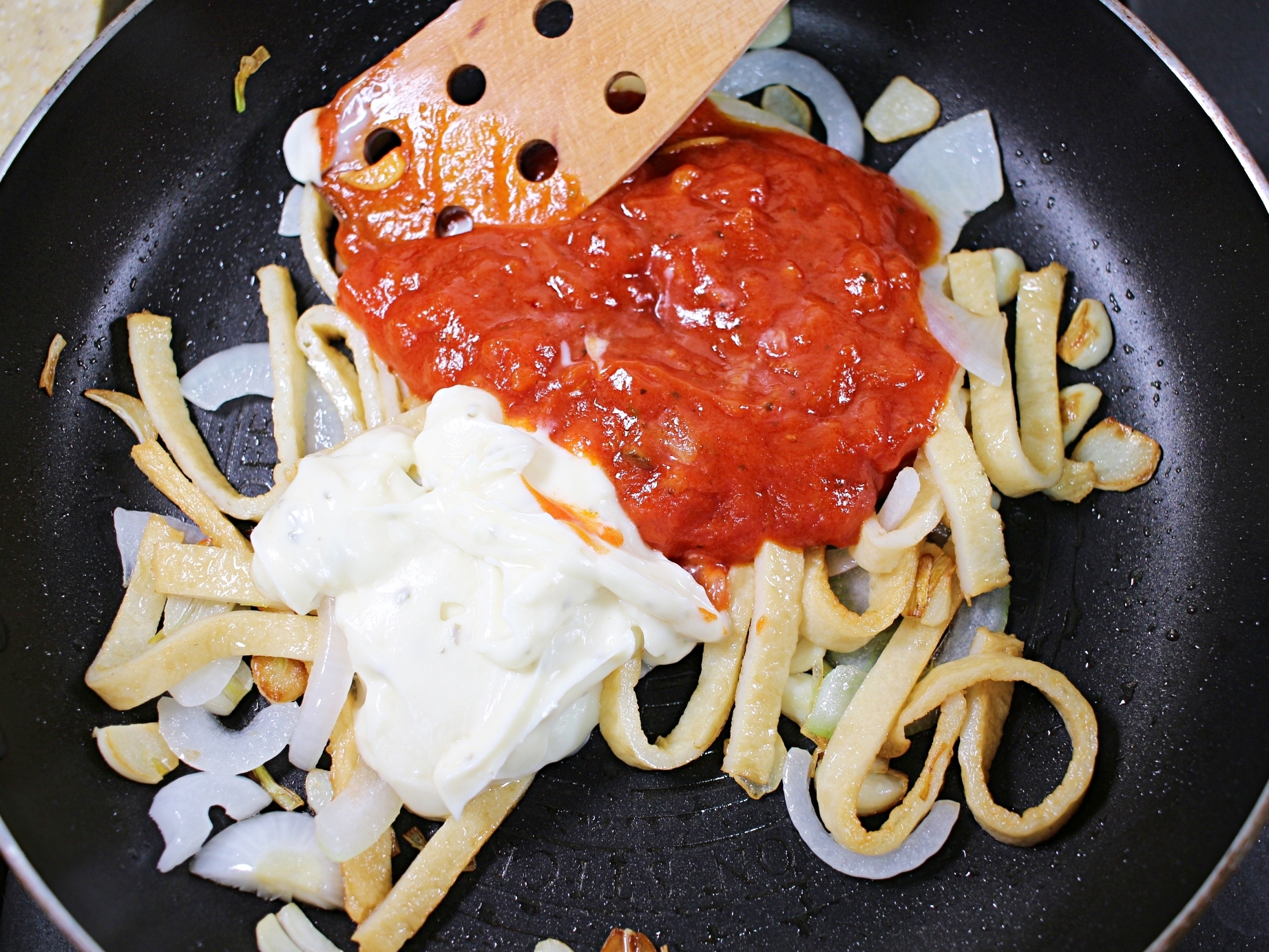 어묵이 연한 갈색으로 익으면 파스타소스를 붓고