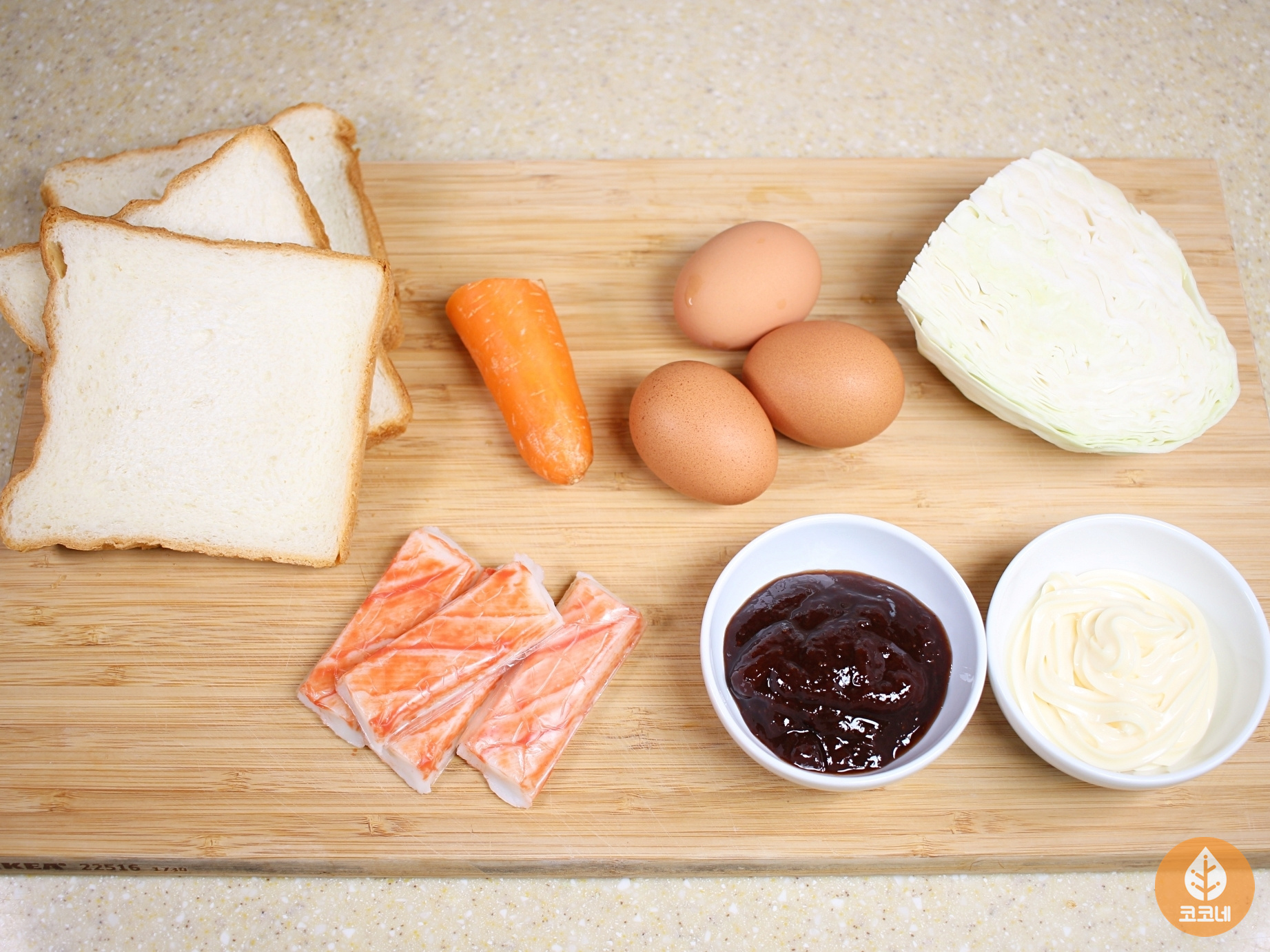 재료는 식빵, 양배추, 당근, 계란, 크래미, 딸기잼,